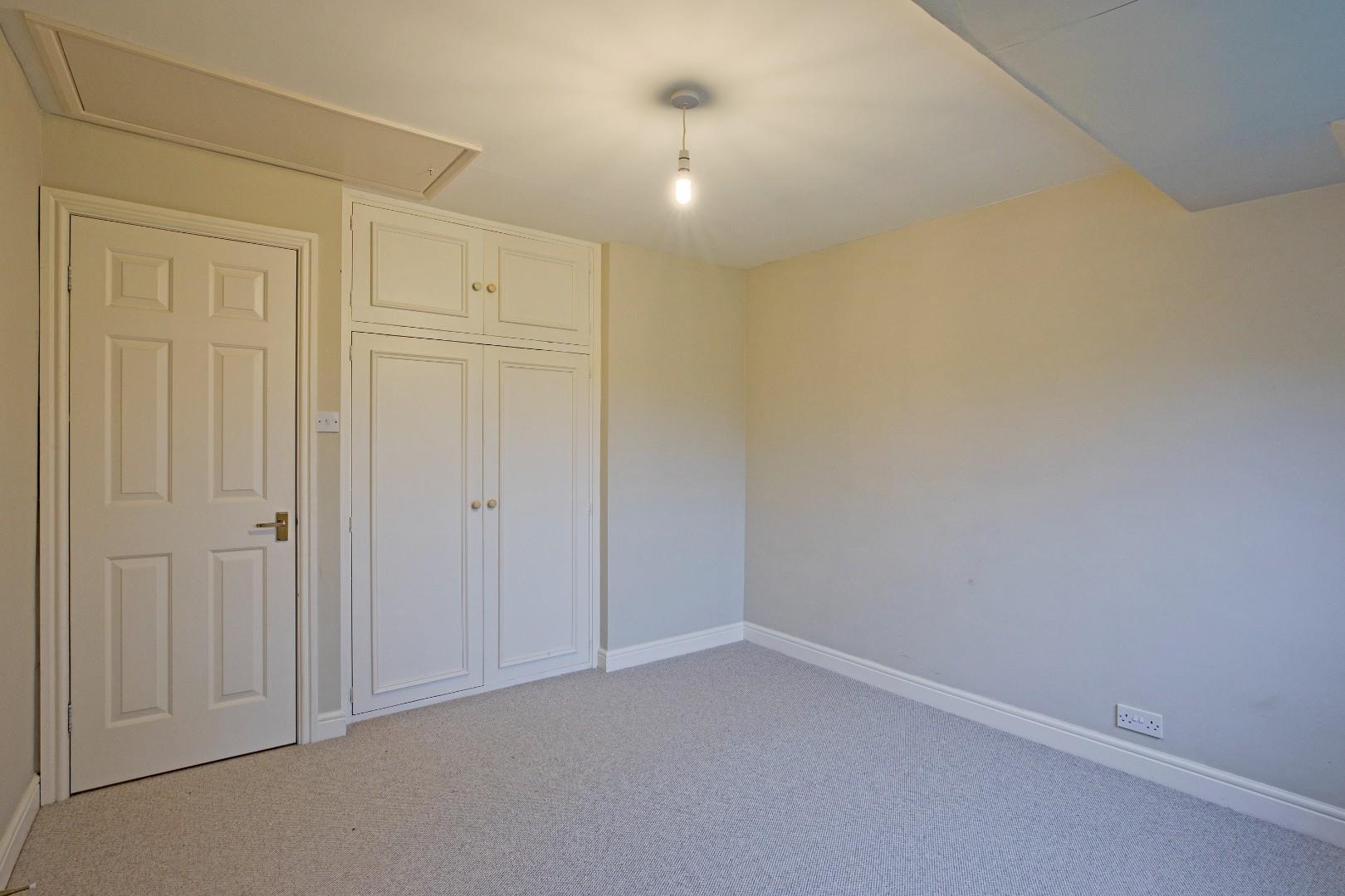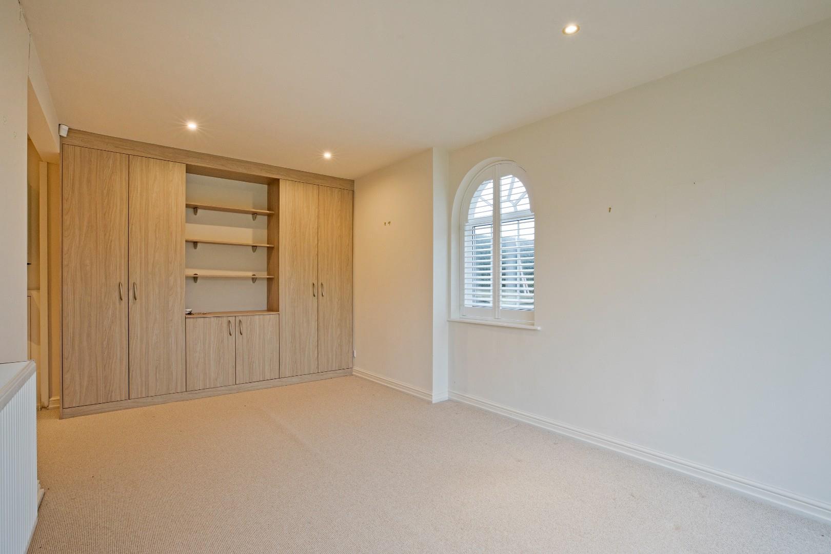 A dual aspect room with arched, double glazed window with plantation shutters and tall, double glazed, sliding patio doors overlooking the garden and fields beyond. Carpeted flooring, radiator, downlighting. Pale wood effect fitted cupboards and shelving provide excellent storage. Wall mounted, gas central heating boiler.