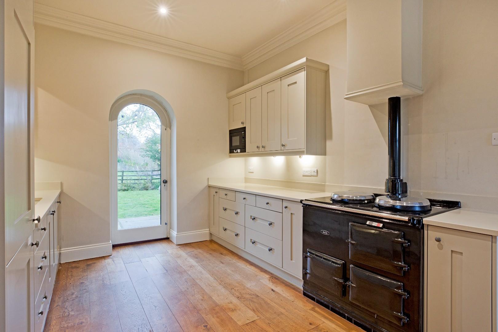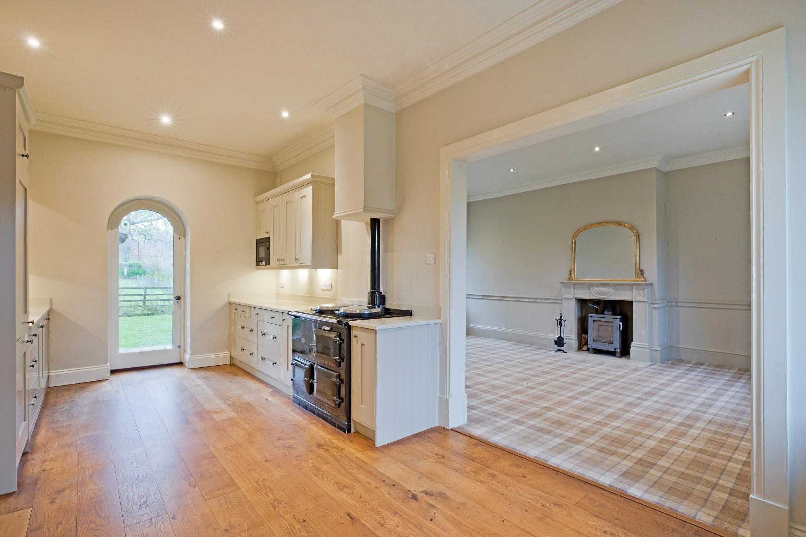 A charming breakfast kitchen fitted with a range of stone coloured, solid wood cabinetry with stainless steel doorknobs, complementary worksurfaces and upstands and a range of integrated appliances including fridge/freezer, Smeg dishwasher and beautiful AGA. One and a half bowl sink with traditional style, chrome mixer tap, high ceilings accentuate the feeling of space. Solid wood flooring, doors to both the front and rear of the property enjoy wonderful views and allow natural light, in addition to an arched window to the rear with deep windowsill. Open to: