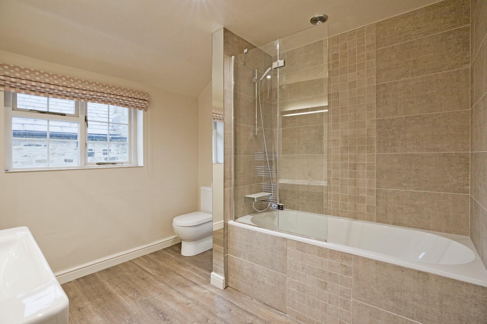 A good sized, contemporary styled ensuite bathroom with low-level W.C., large handbasin with deep vanity drawer beneath and bath with tiled side with thermostatic shower, glazed, folding screen and attractive wall tiling. Downlighting, extractor, radiator. Chrome, ladder style, heated towel rail, double glazed window to rear enjoying lovely countryside views. Dark wood laminate flooring.