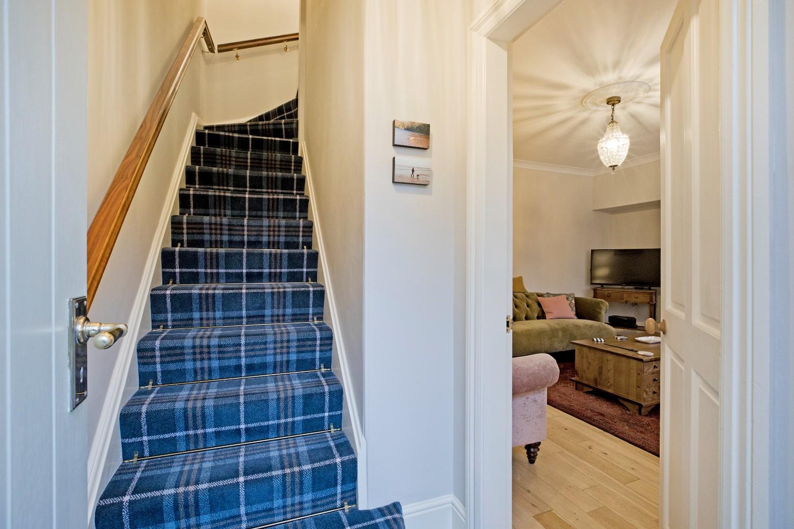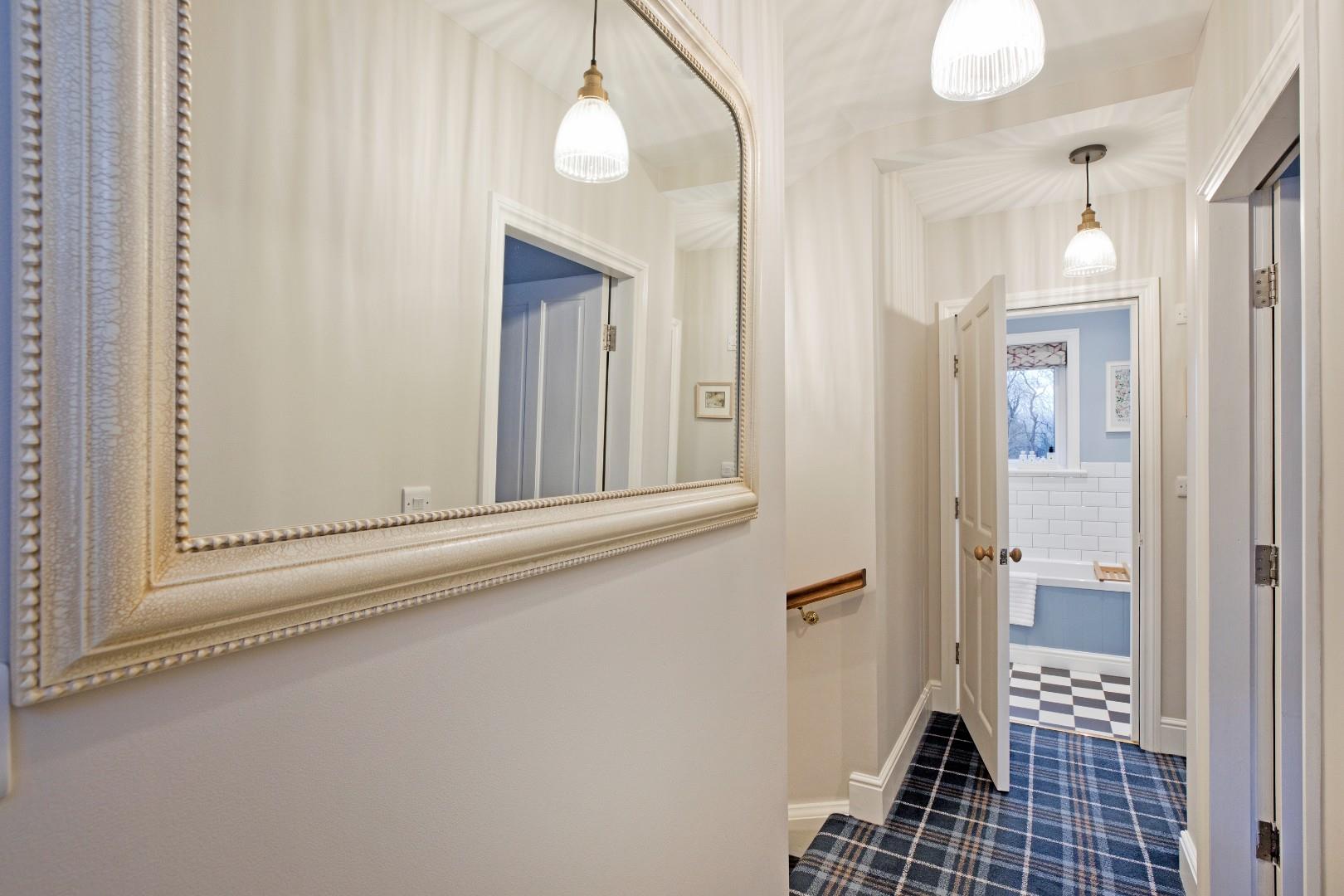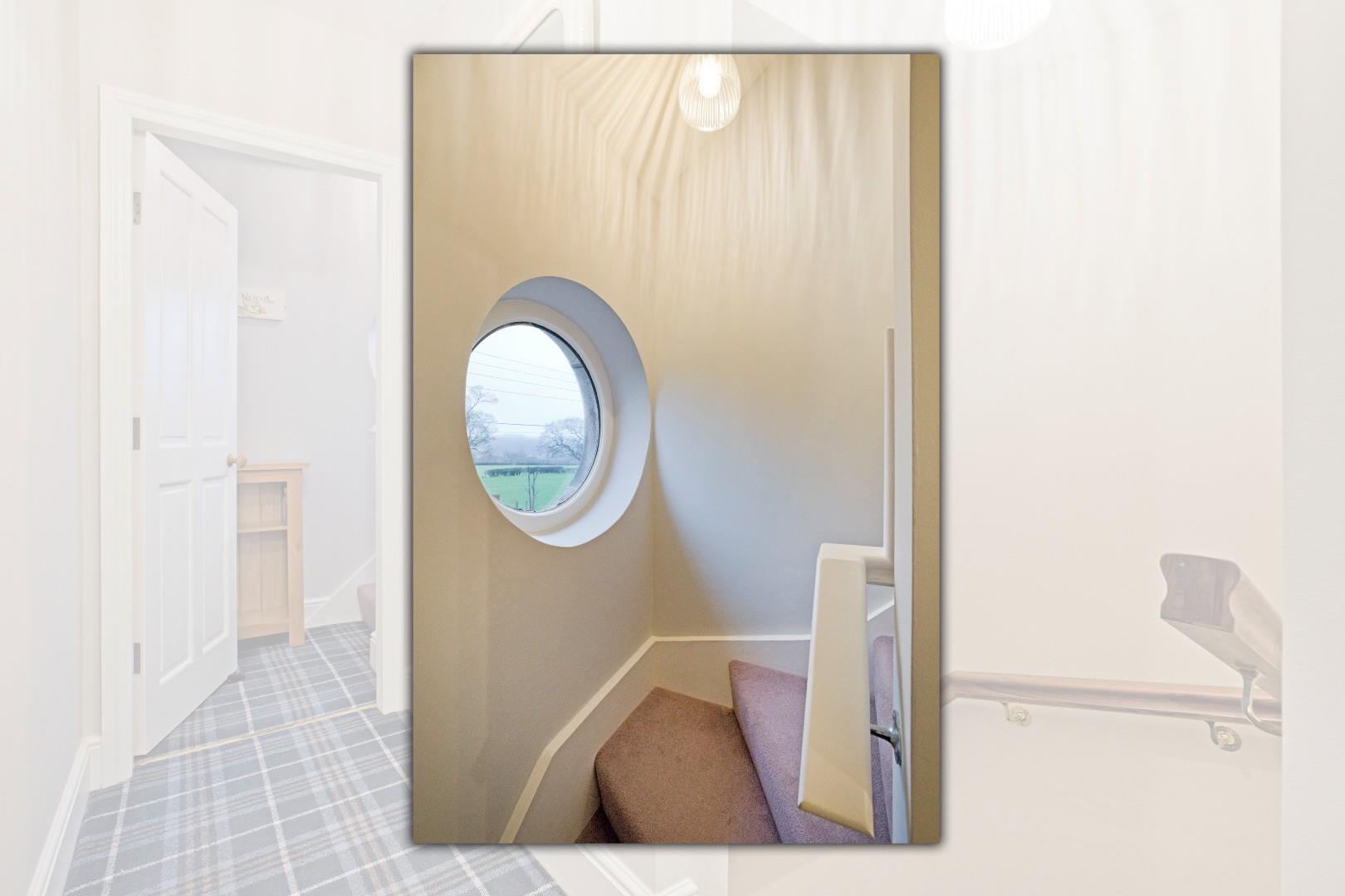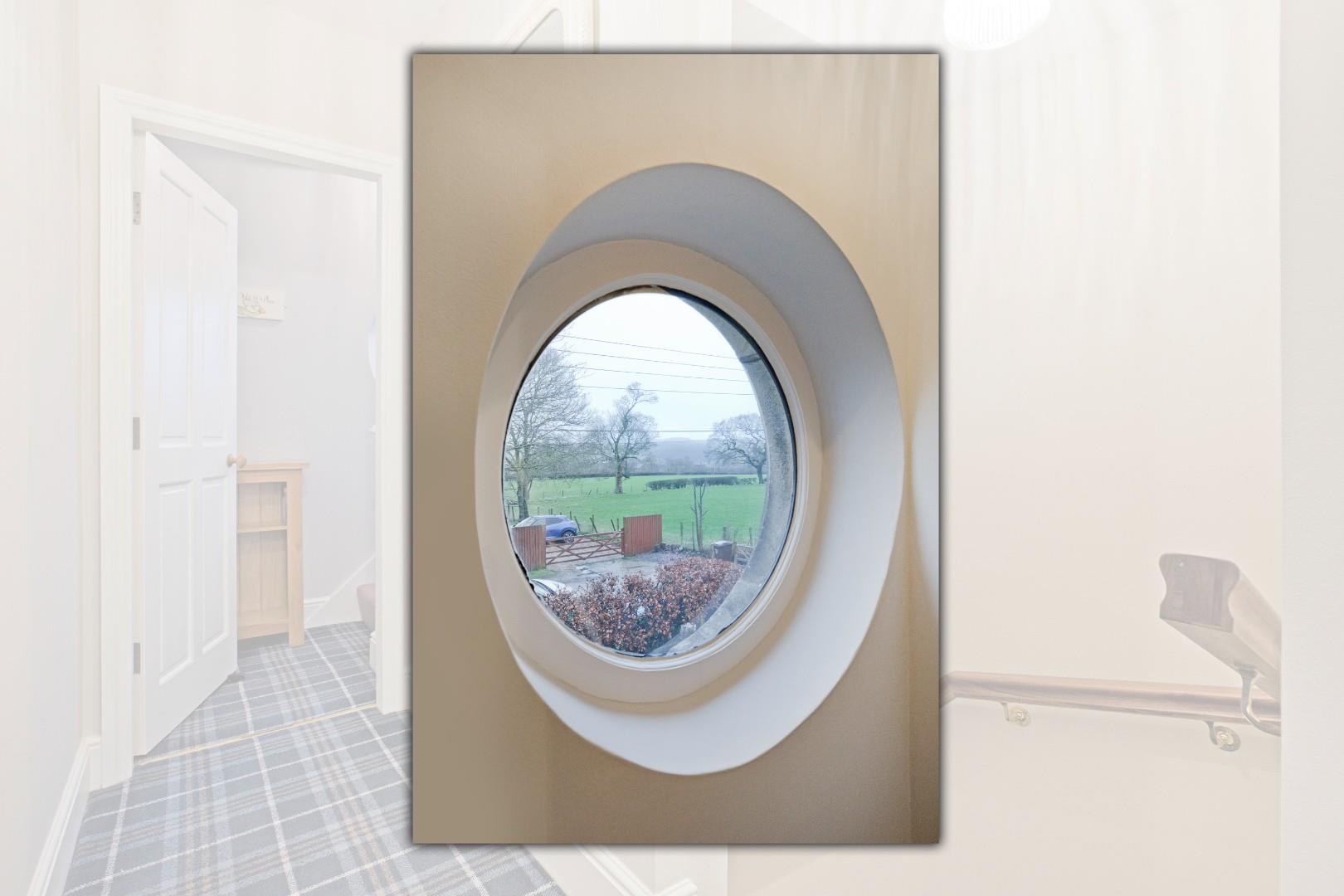 Stairs lead up to a spacious, carpeted landing with access to two double bedrooms and the house bathroom. A door from the principal landing opens onto a further small landing area from which the wide, carpeted return staircase continues leading up to the second floor. A most charming, circular, timber framed, double-glazed window is a lovely feature whilst allowing further light in from the south and providing another opportunity to savour the wonderful view!