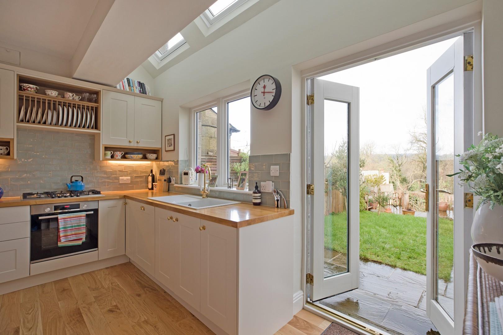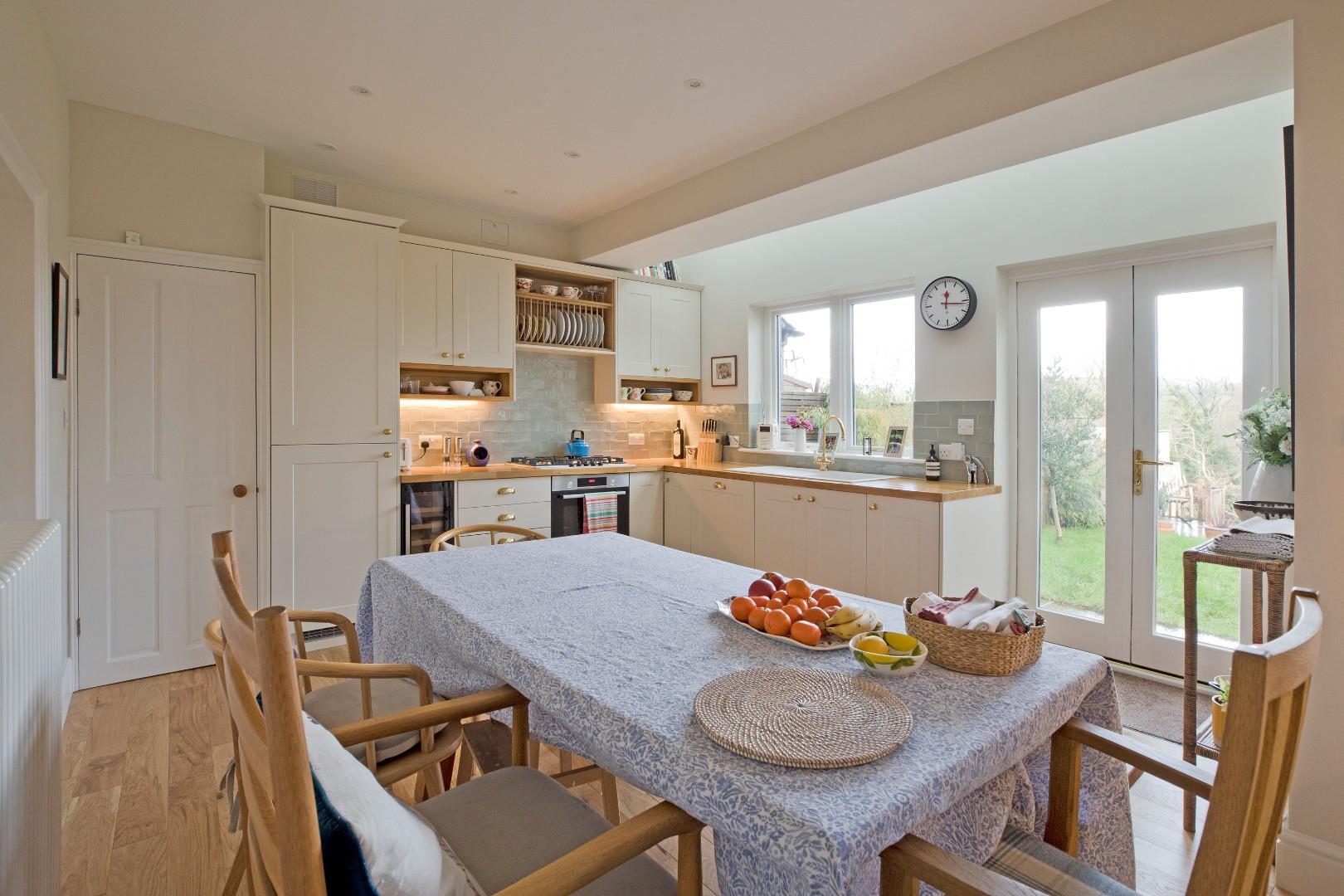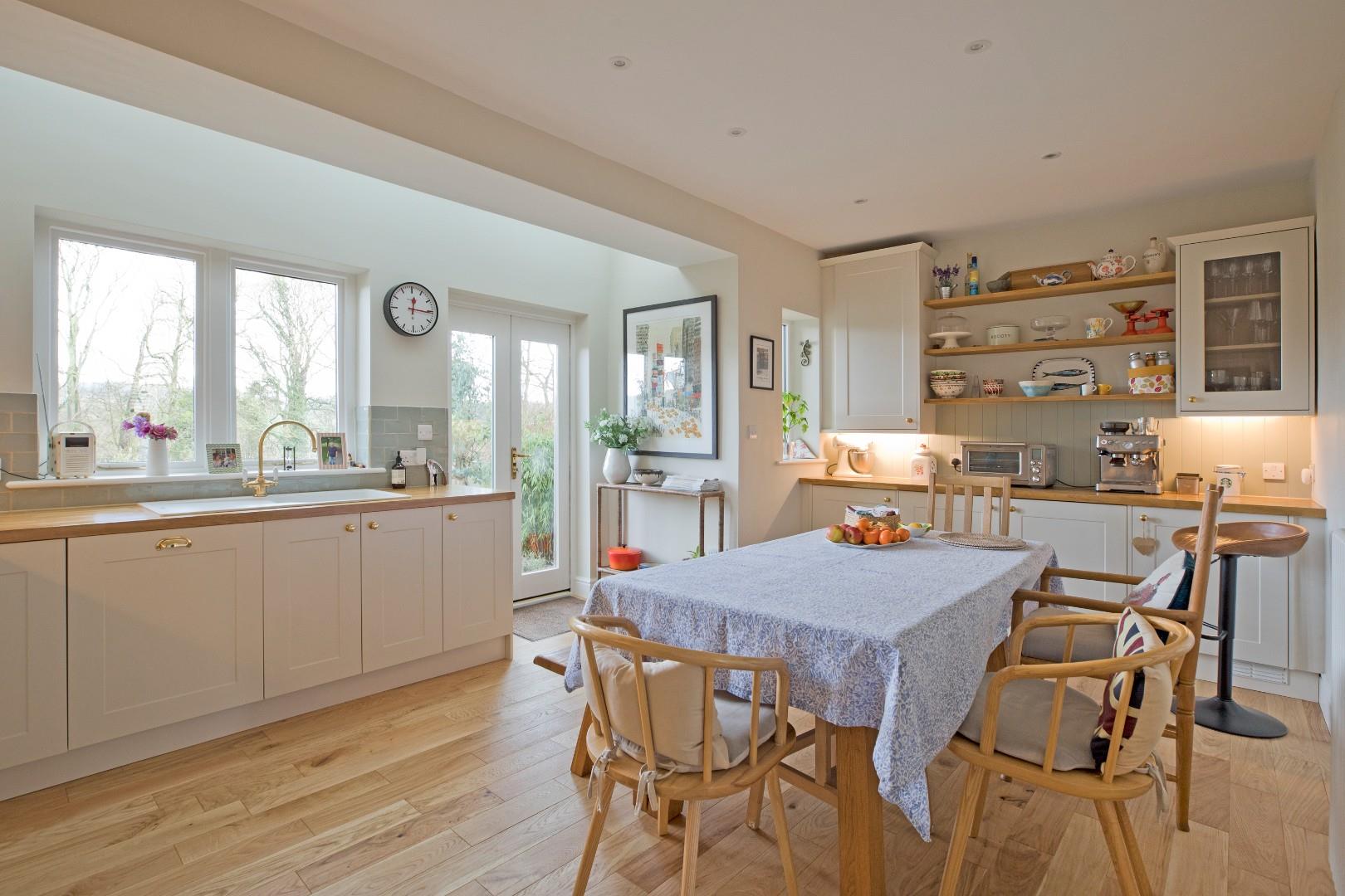 A half-glazed, timber door opens into the beautiful, bespoke, fully fitted kitchen boasting an extensive range of stylish wall and base cupboards with complementary solid wooden worksurfaces over with attractive, tiled splashback. The cottage feel comes across in the charming plate rack and oak shelving. Integrated appliances include a Bosch electric oven with Bosch five burner stainless-steel gas hob over, a Bosch dishwasher, a fridge/freezer and a wine fridge. A Franke composite sink with drainer and traditional style, monobloc tap sits beneath a timber framed, double-glazed window offering a delightful view over the lovely, rear patio, garden and the countryside beyond. Three Velux windows and a further timber framed, double-glazed window enhance the bright atmosphere. Engineered, oak flooring, traditional style radiator, under pelmet lighting and downlighting. Room for a large, family dining table. A cupboard houses the recently serviced Worcester central heating boiler. Space and plumbing for a washing machine and space for a tumble drier. French doors lead out onto the rear patio and garden.
