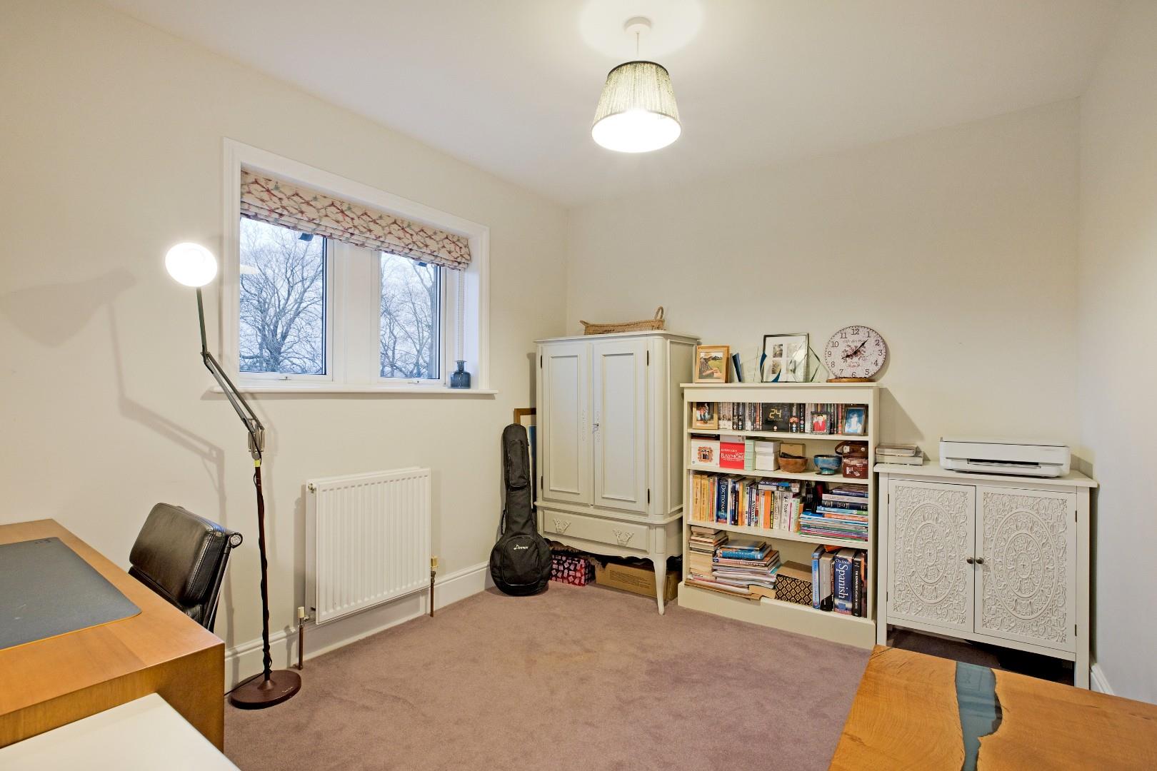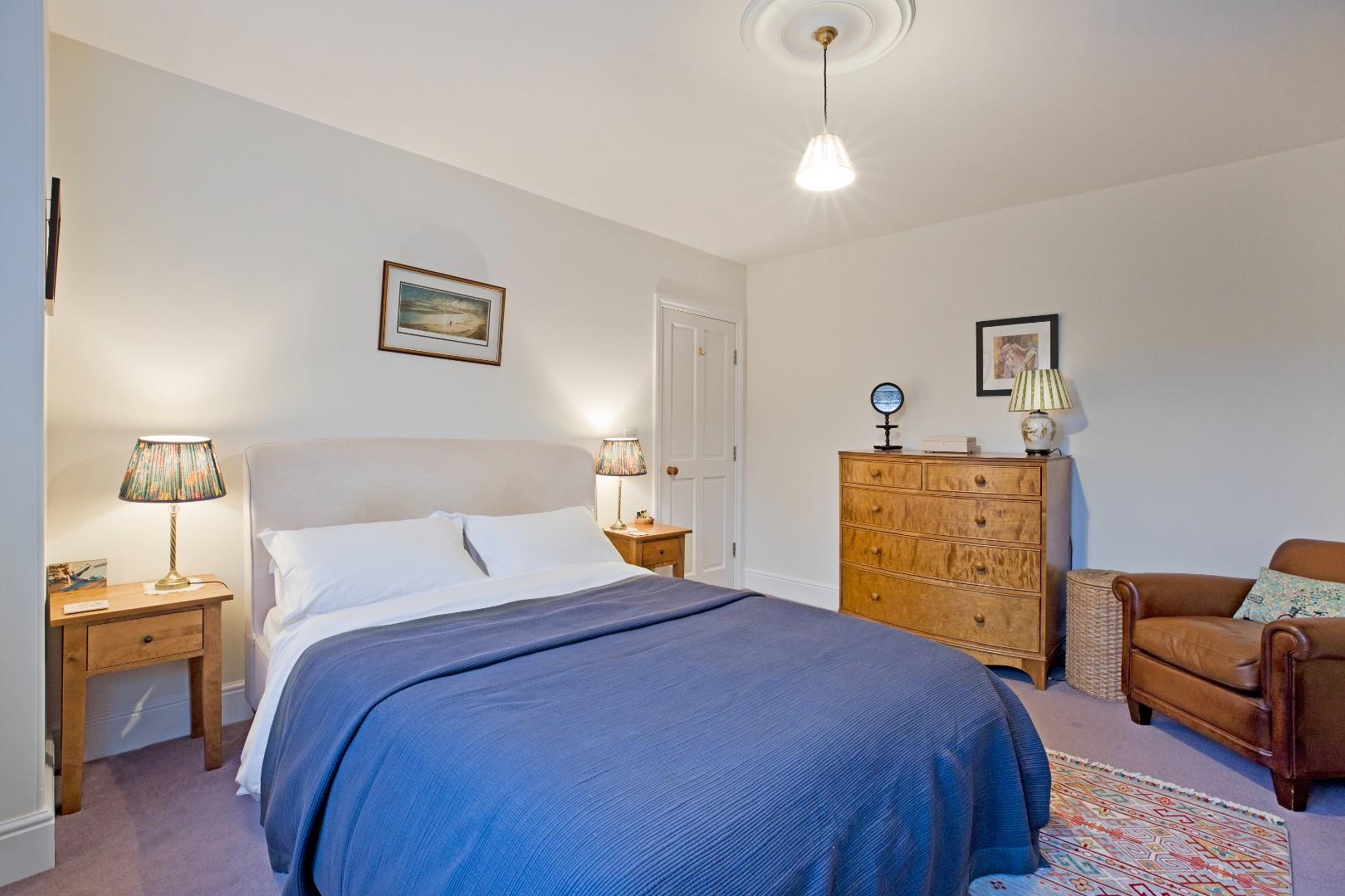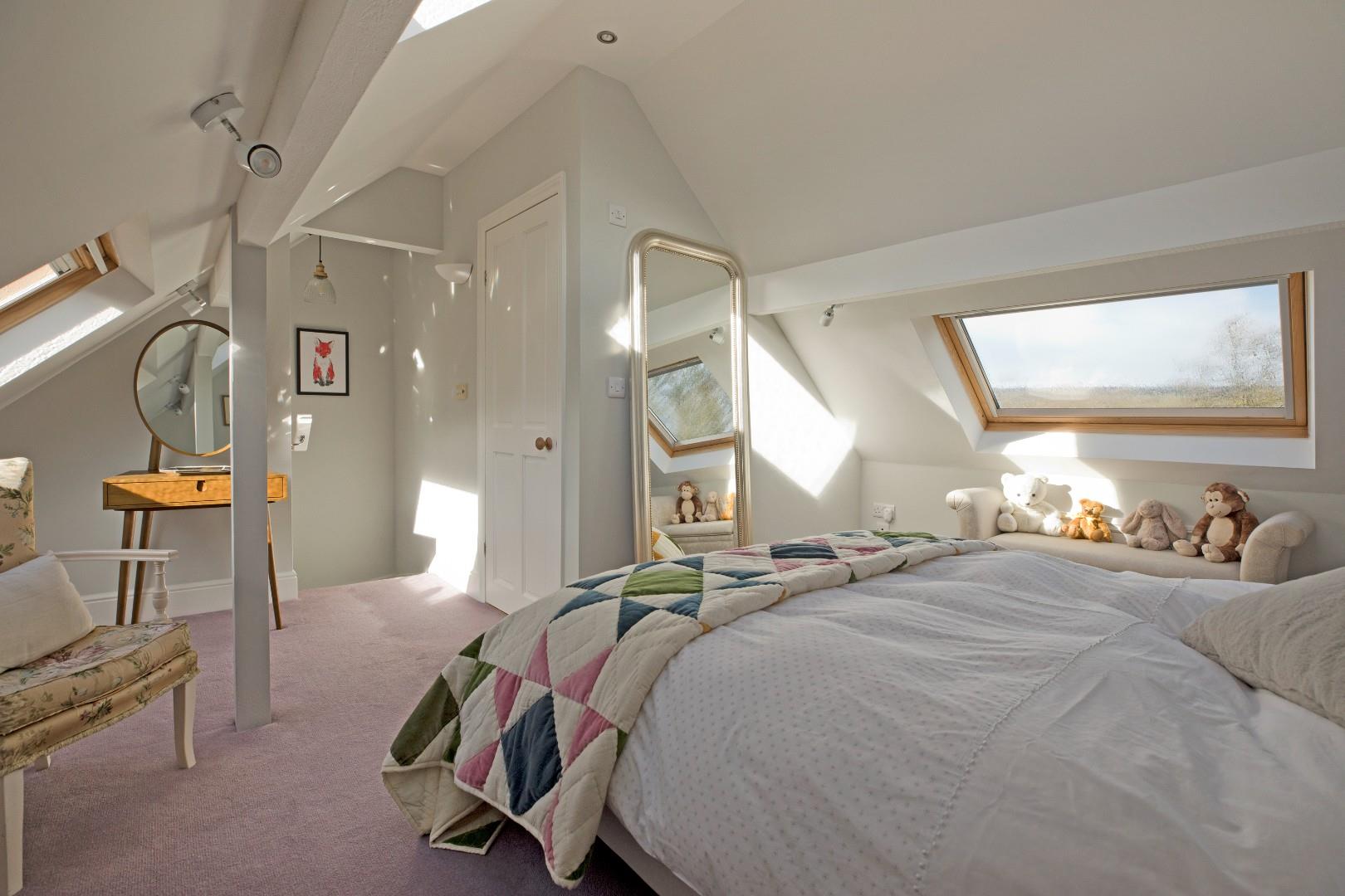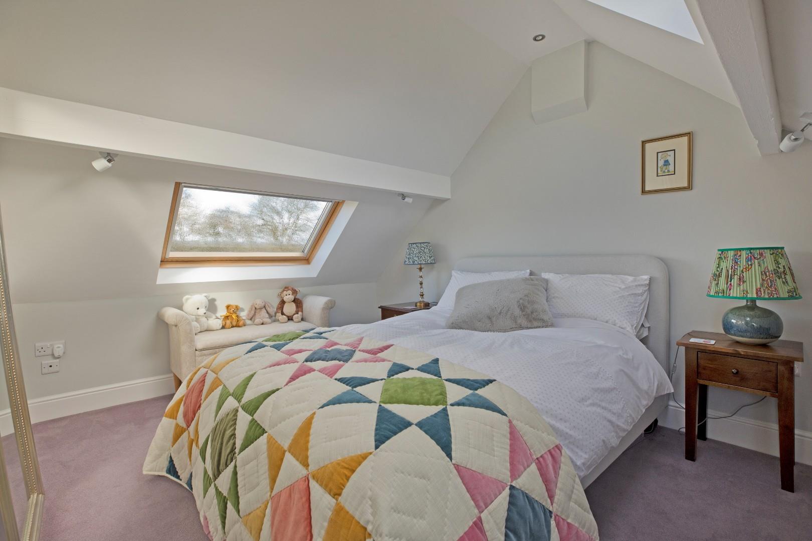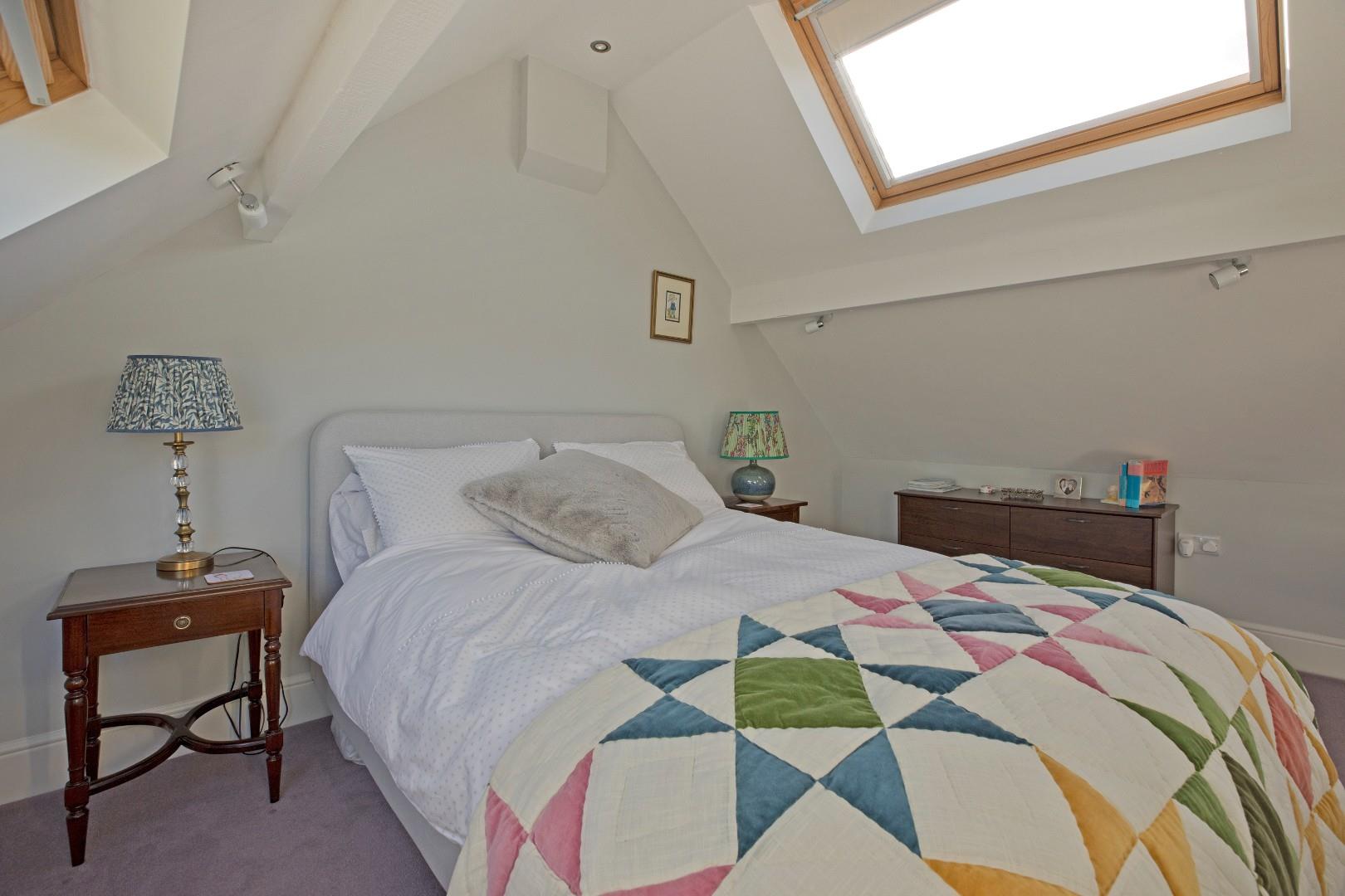 A fabulous, good-sized, double bedroom, which benefits from an en-suite shower room, also making it an ideal guest room. Three large Velux windows with fitted, blackout blinds allow the natural light to flood in. Carpeting, radiator, downlighting and under eaves storage to both elevations.