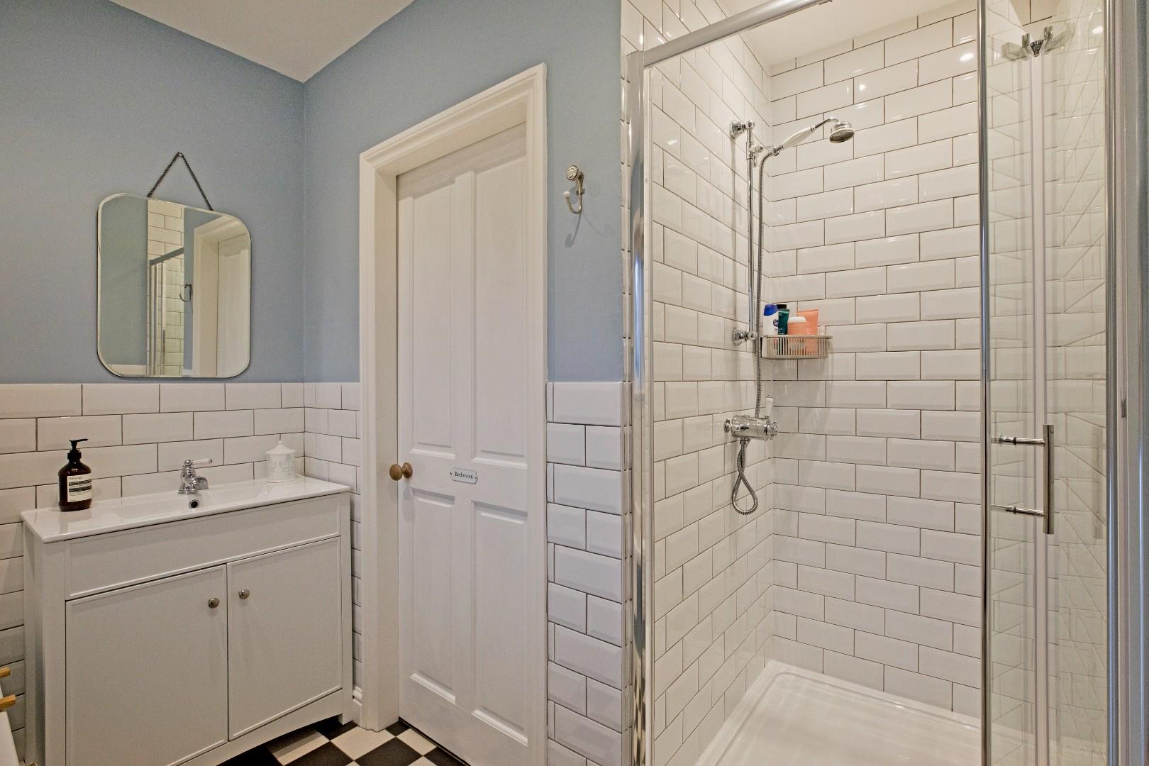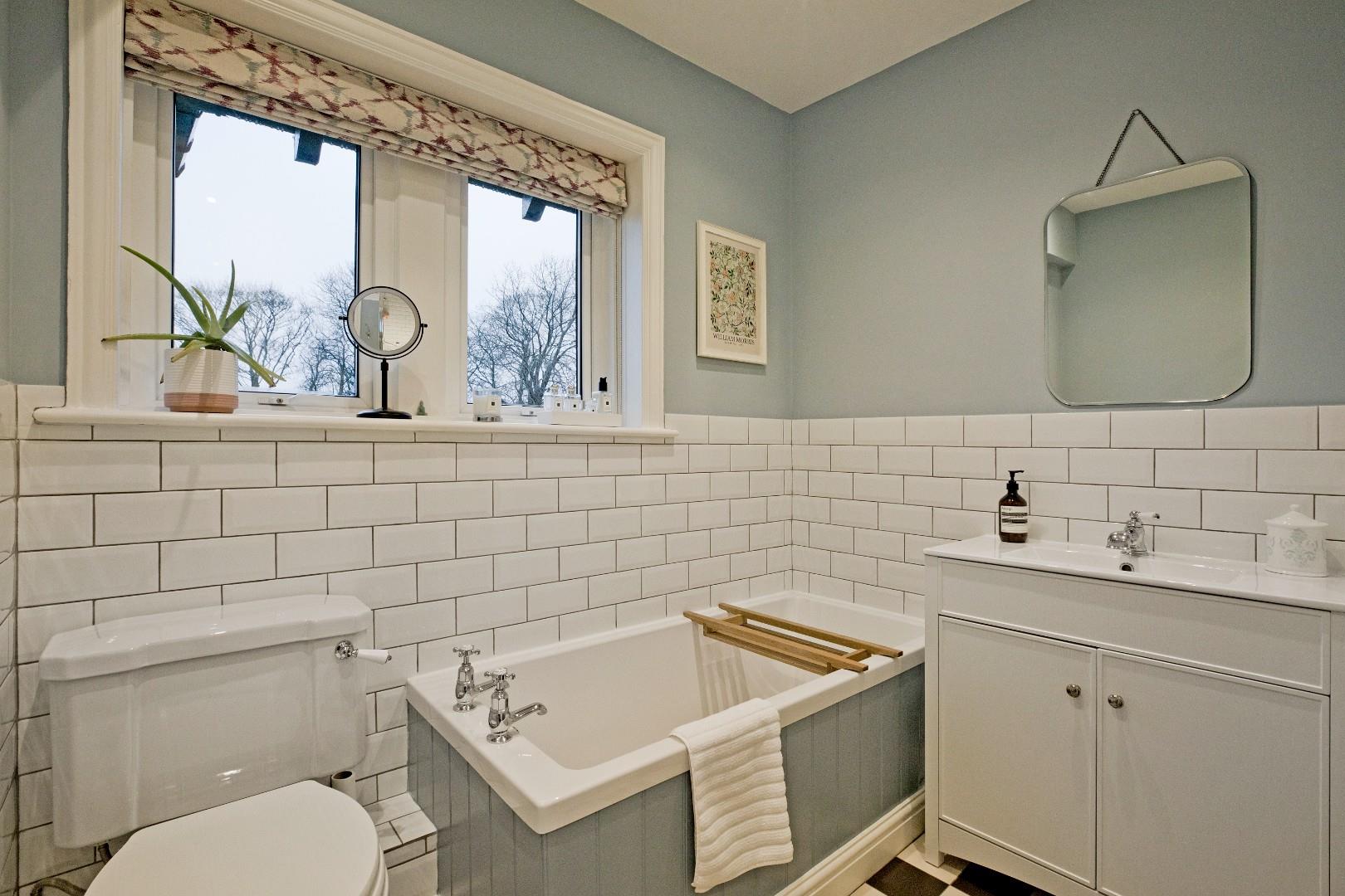 A stunning, four-piece house bathroom comprising a panel bath with traditional style taps, a large, walk in shower with bi-fold, glazed door and mains shower with traditional style fittings, an attractive, vanity washbasin with traditional style taps and double cupboard underneath and a low-level w/c. Beautiful, Victorian style ,tiled flooring, traditional style radiator and downlighting. Fully tiled around the shower and half-tiled elsewhere. A UPVC, double-glazed window affords a beautiful view over the surrounding countryside.