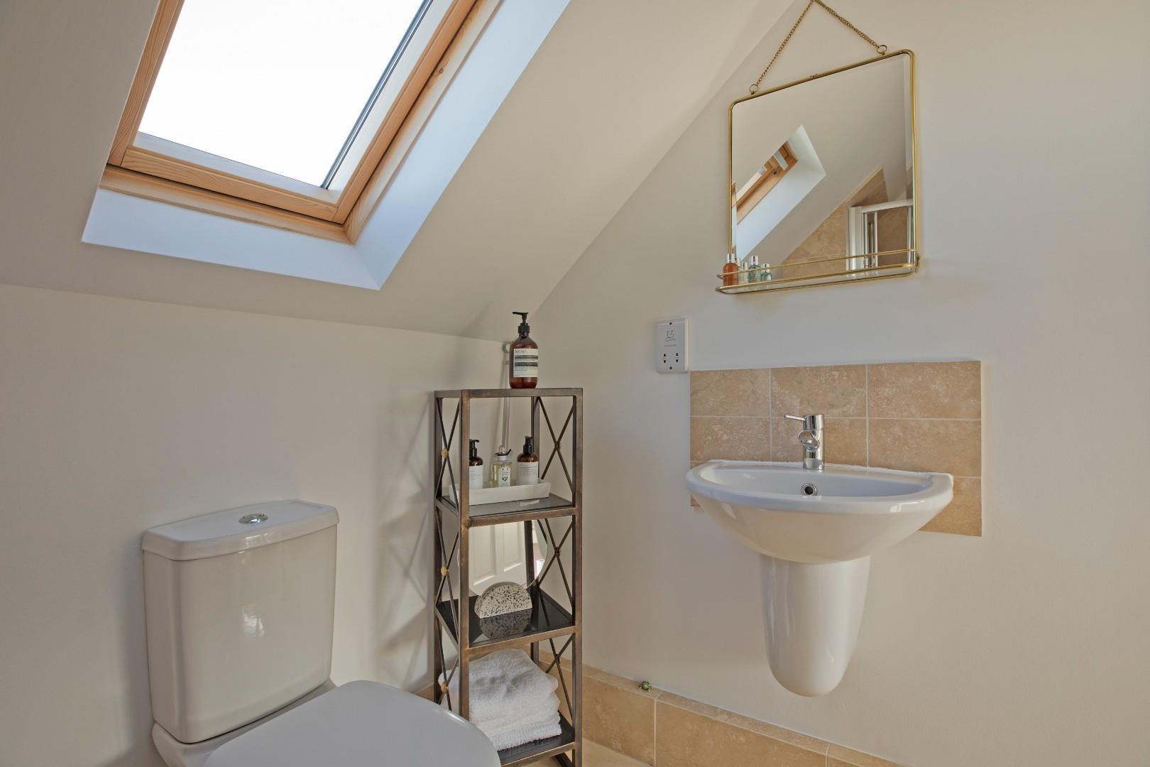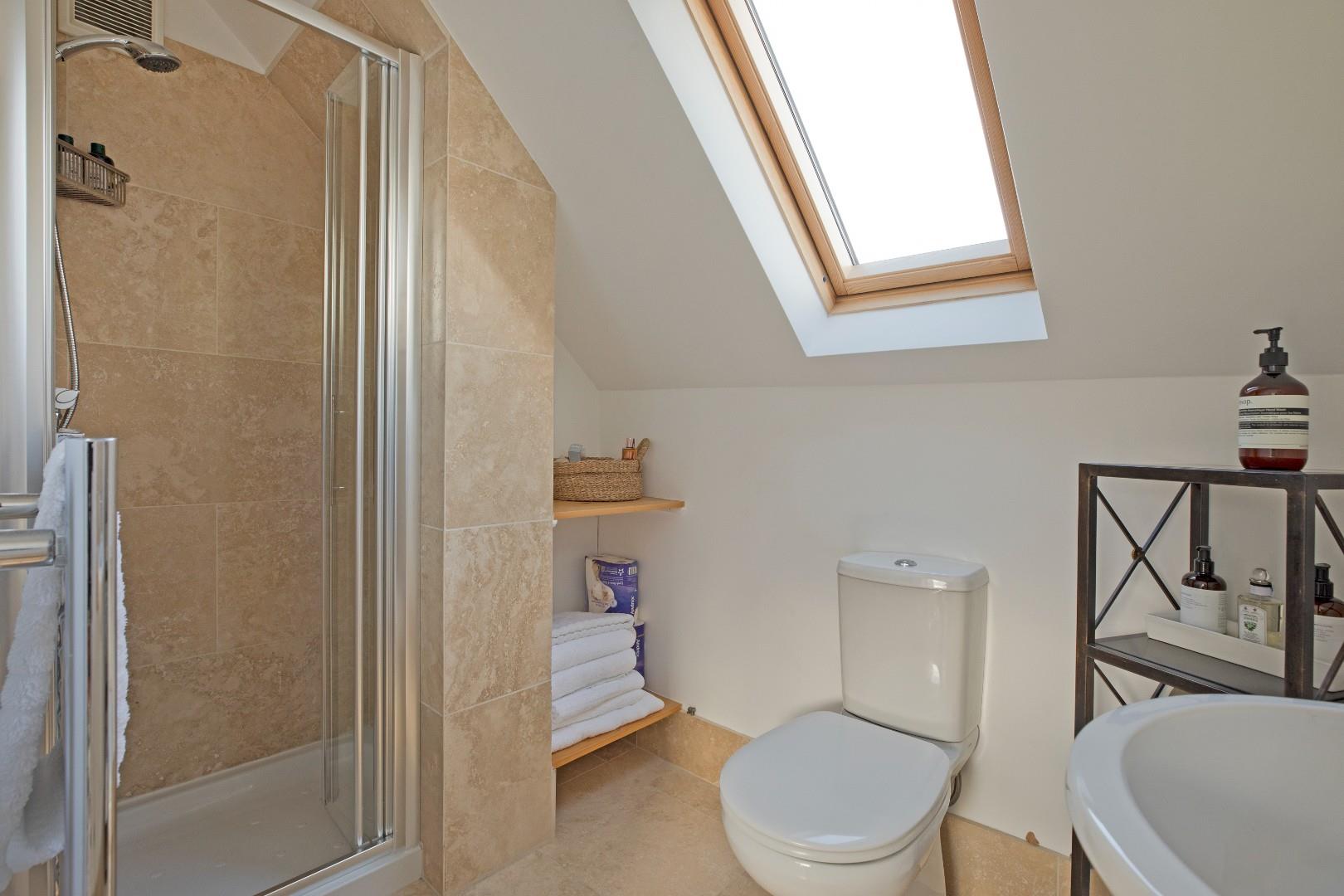A smartly presented, modern shower room comprising of a walk-in shower cubicle with bi-fold, glazed doors and mains shower, a wall hung washbasin with monobloc tap and tiled splashback and a low-level w/c. Chrome ladder towel radiator, ceramic tiled flooring and extractor fan. Fully tiled around the shower with matching floor tiling. Useful, fitted wall shelving. A Velux window allows the natural light to flood in.