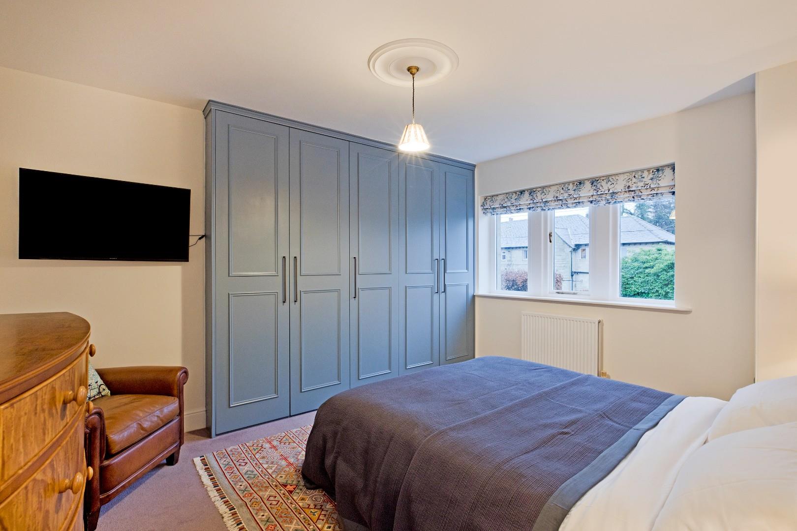 A generously proportioned, double bedroom to the front of the property. Light floods in through the timber framed, double-glazed window, which affords a stunning view towards the moors. Bespoke, contemporary, fitted wardrobes, carpeted flooring, radiator and TV point.