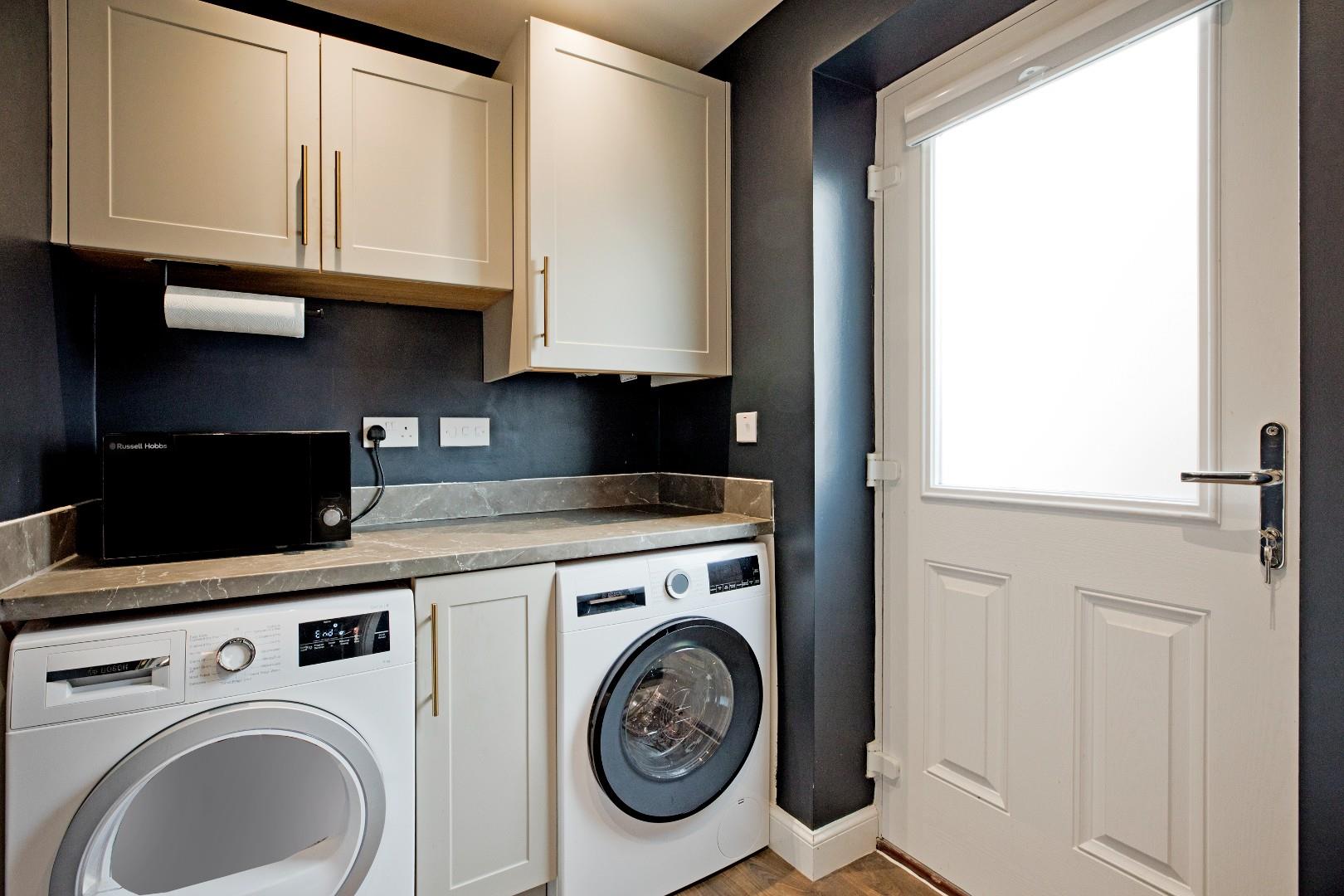 With Shaker style fitted cupboards, complementary worksurface and upstands with space and plumbing for a washing machine and tumble dryer. Continuation of the vinyl flooring, extractor, recessed ceiling lights, radiator. A half obscure glazed, composite door leads out to the driveway to the side of the property.