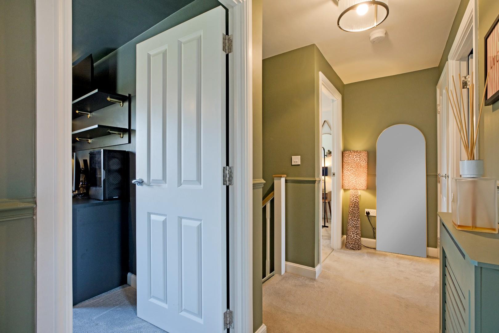 A return, carpeted staircase with timber balustrading leads to the first floor of the property, where doors open into four bedrooms, the master benefiting from an ensuite shower room, and the three-piece house bathroom. Recessed cupboard providing useful storage, radiator beneath radiator cover.