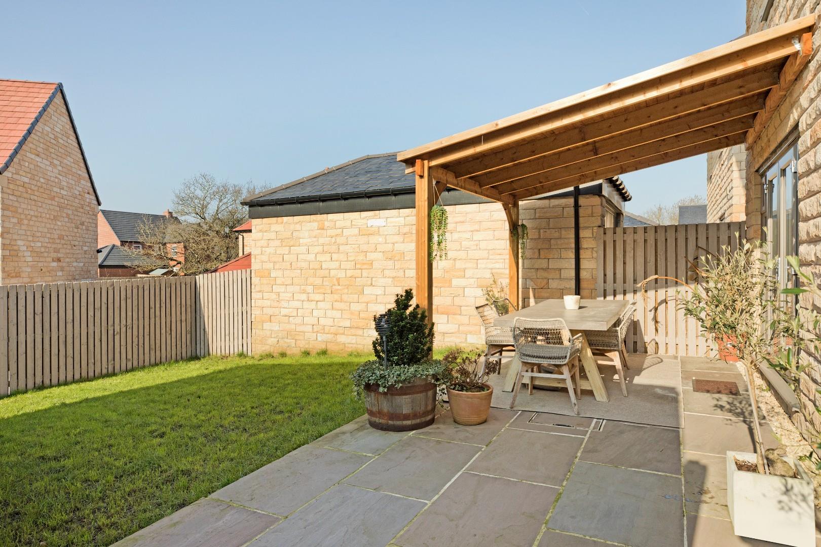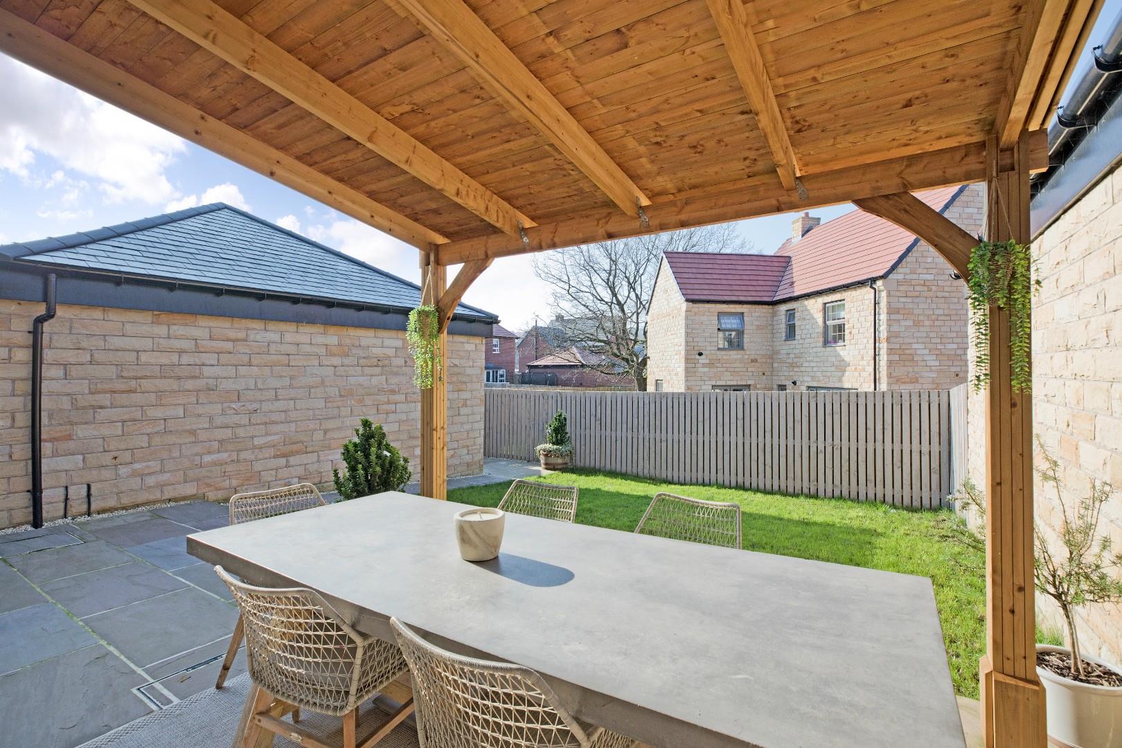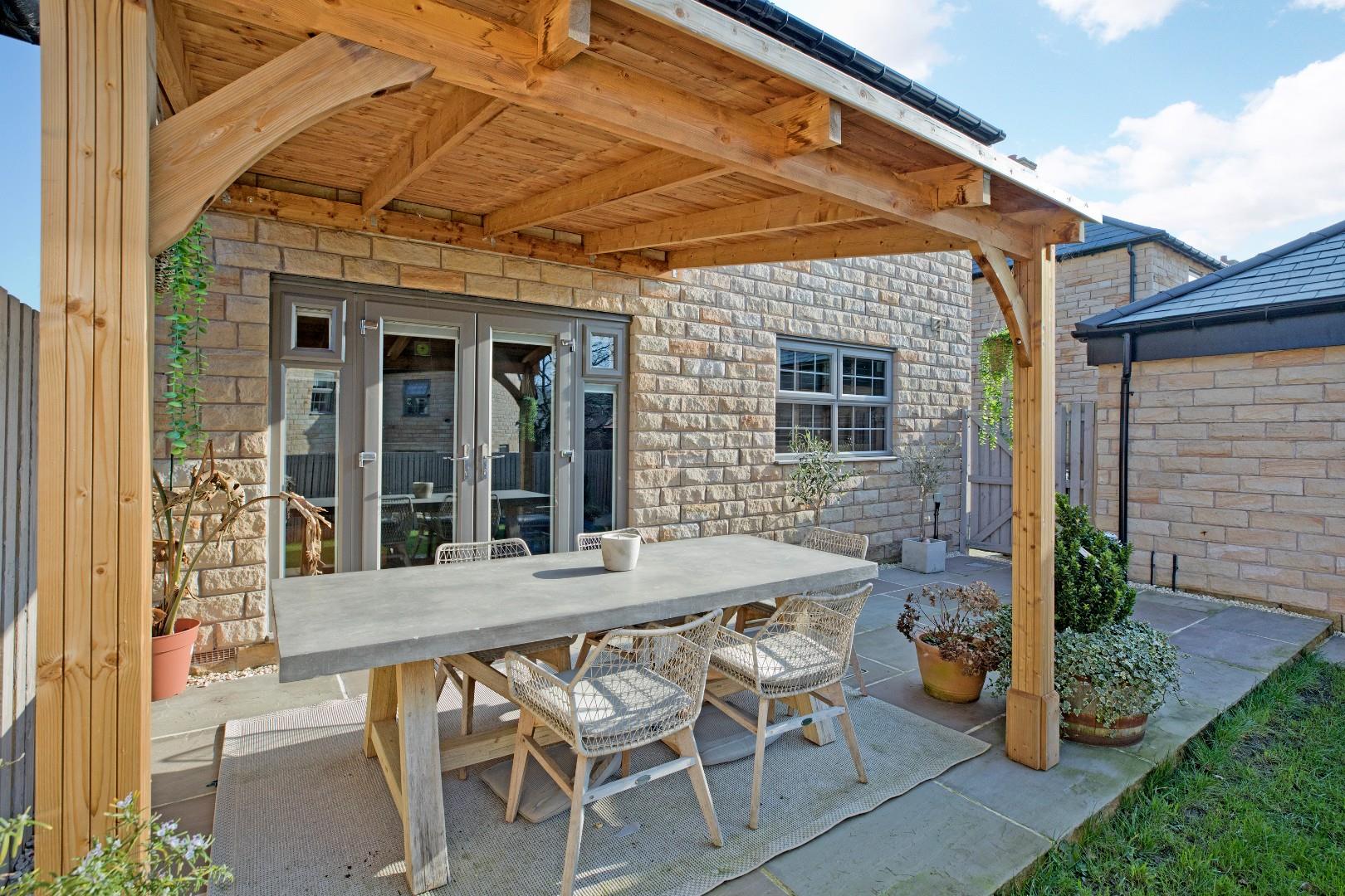 The property benefits from a recently landscaped, delightful, rear garden with good sized area of lawn bound by smart fencing and a beautiful, large, Yorkshire stone patio, ideal for alfresco dining and entertaining with a recently added, solid timber pagoda, the perfect entertaining space. A timber gate to the side gives access to the driveway and garage. Outside tap.