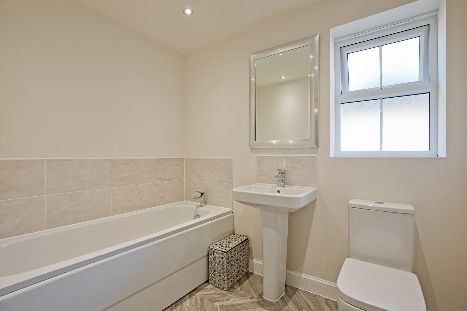 A very well presented, three-piece house bathroom with low-level W.C., pedestal handbasin with chrome mixer tap and tiled splashback and panel bath with central, chrome mixer tap and neutral wall tiling to surround. Parquet style, vinyl flooring, tall, white, ladder style, heated towel rail, extractor, recessed spotlights. Obscure, double glazed window to side elevation.