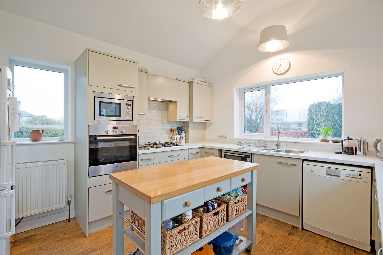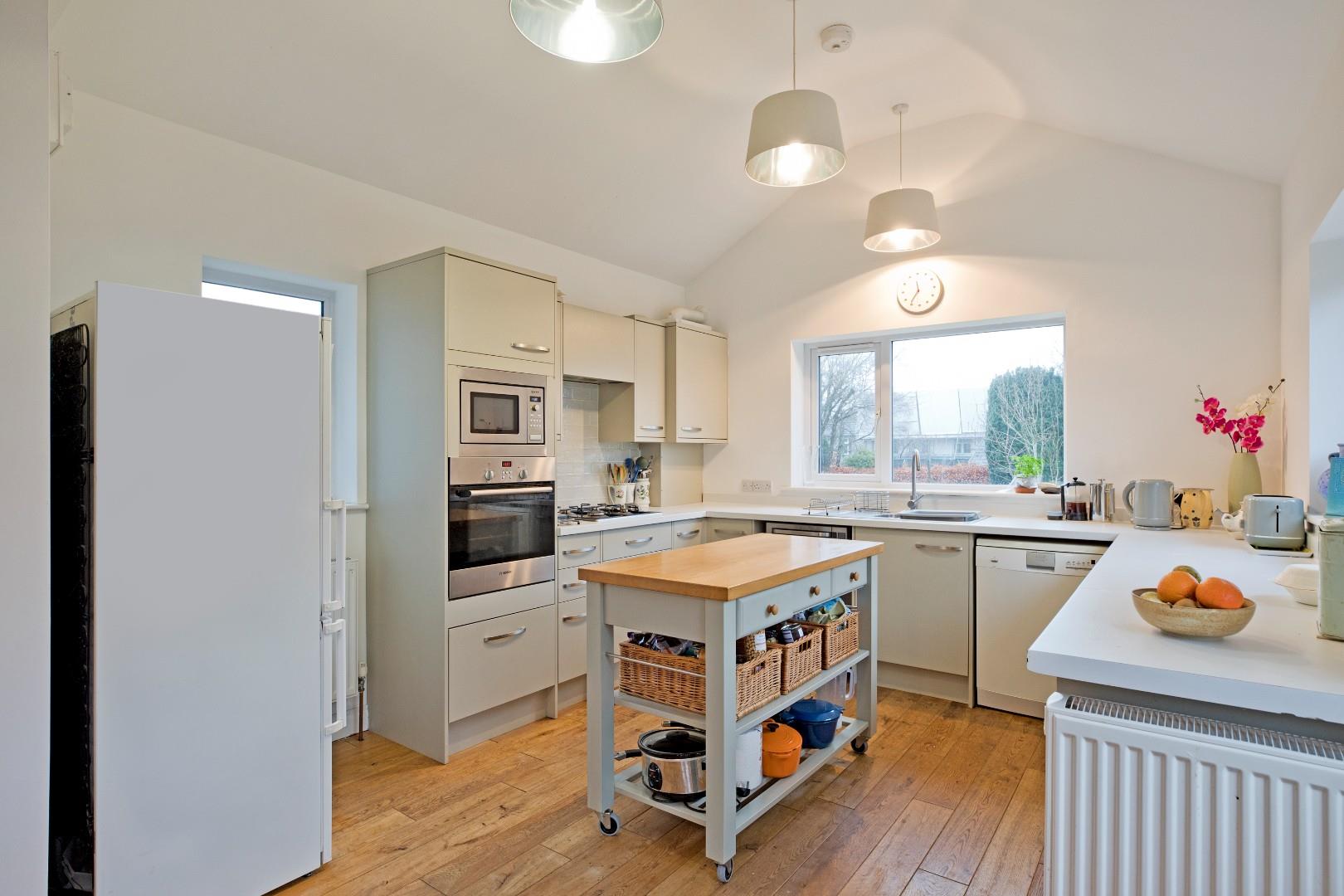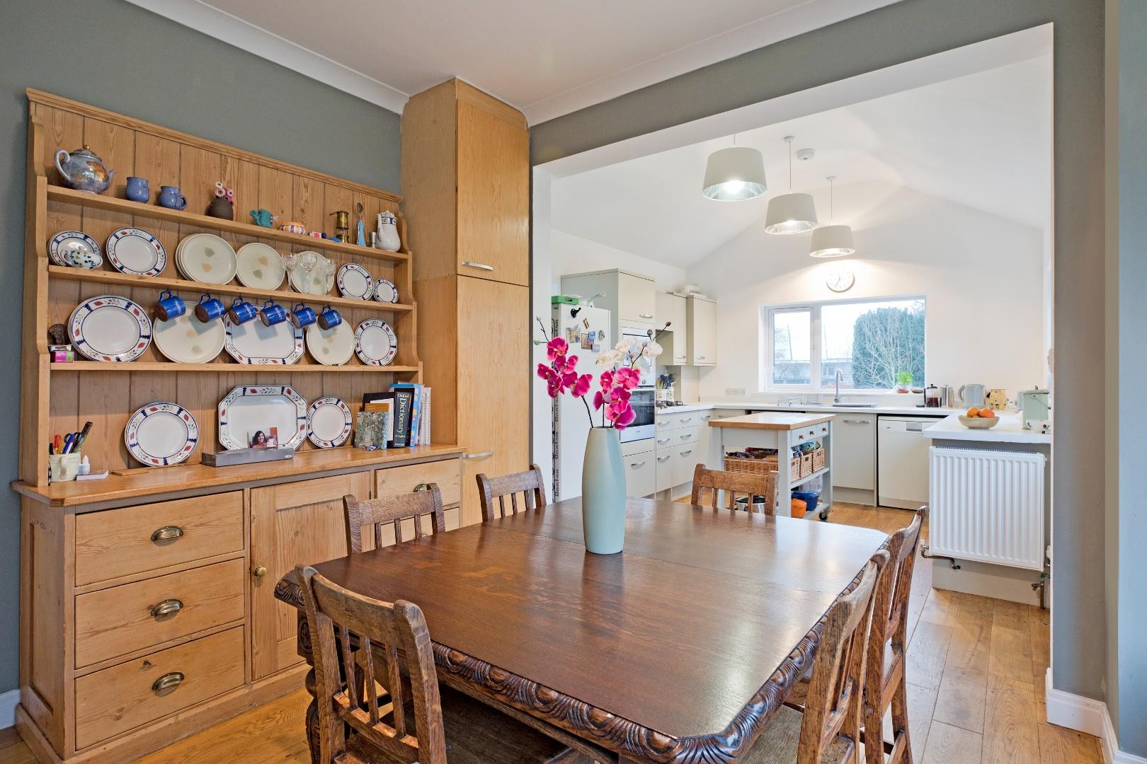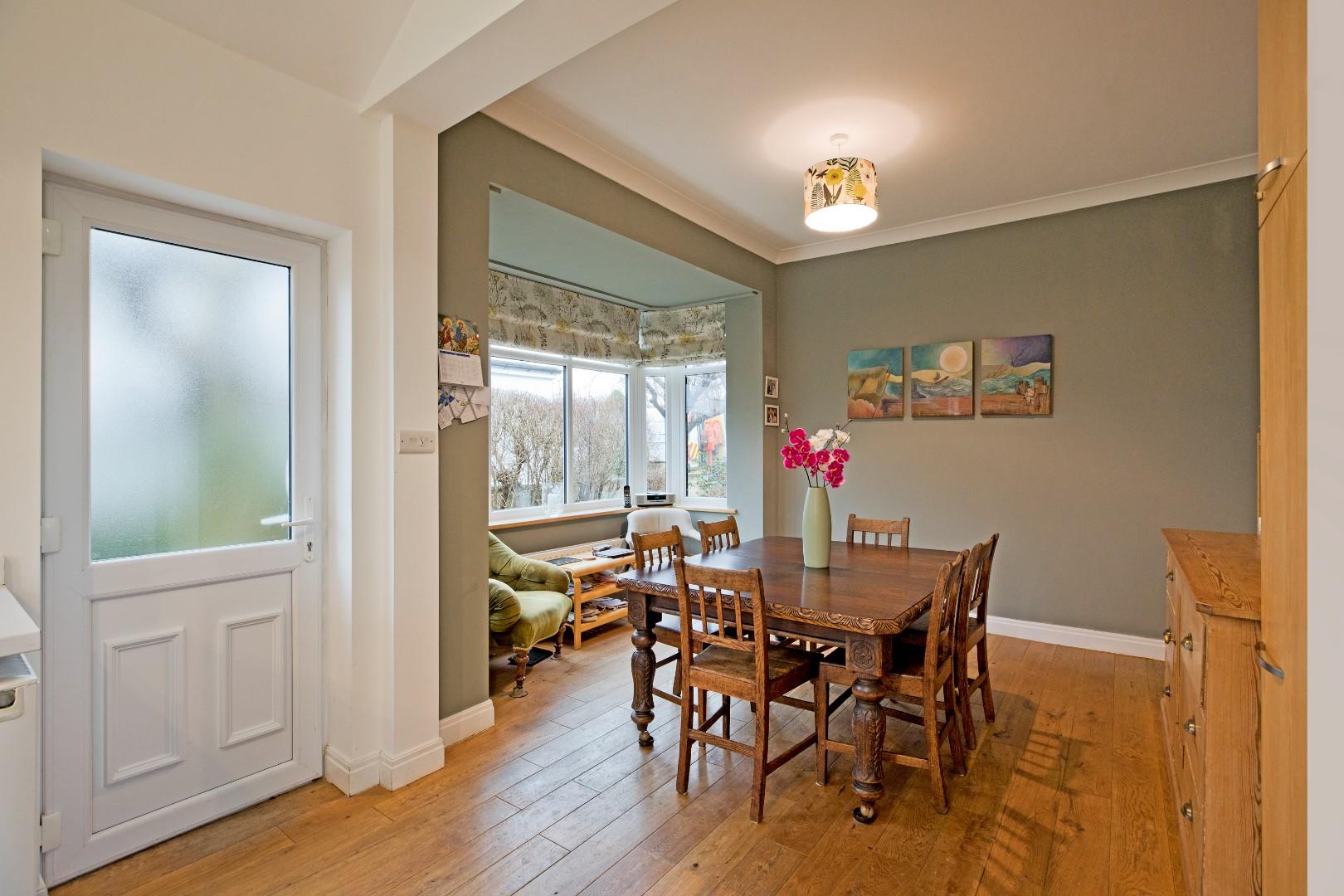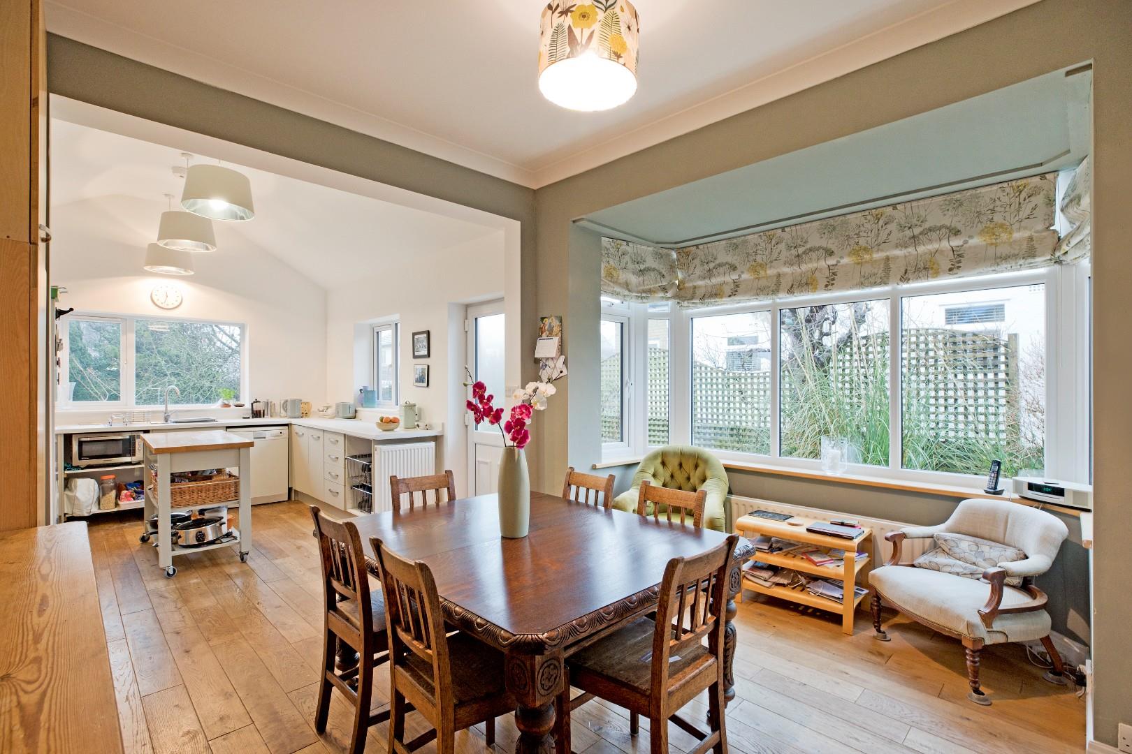 A great sized, living dining kitchen, the hub of the home, with large, double glazed windows enjoying lovely views over the garden and allowing a good degree of natural light. The kitchen is fitted with a range of stone coloured cabinetry with stainless steel handles, complementary worksurfaces and upstands and a range of integrated appliances including electric oven, microwave, four ring gas hob with extractor over and space and plumbing for a dishwasher, washing machine and fridge freezer. A one and a half bowl stainless steel sink and drainer with chrome mixer tap sits beneath a large window to the rear. There is a recently fitted bay window in the dining area to the side elevation, three radiators and solid wood flooring. A half glazed, uPVC door leads out to the garden. There is ample room for a family dining table making this a most sociable space.