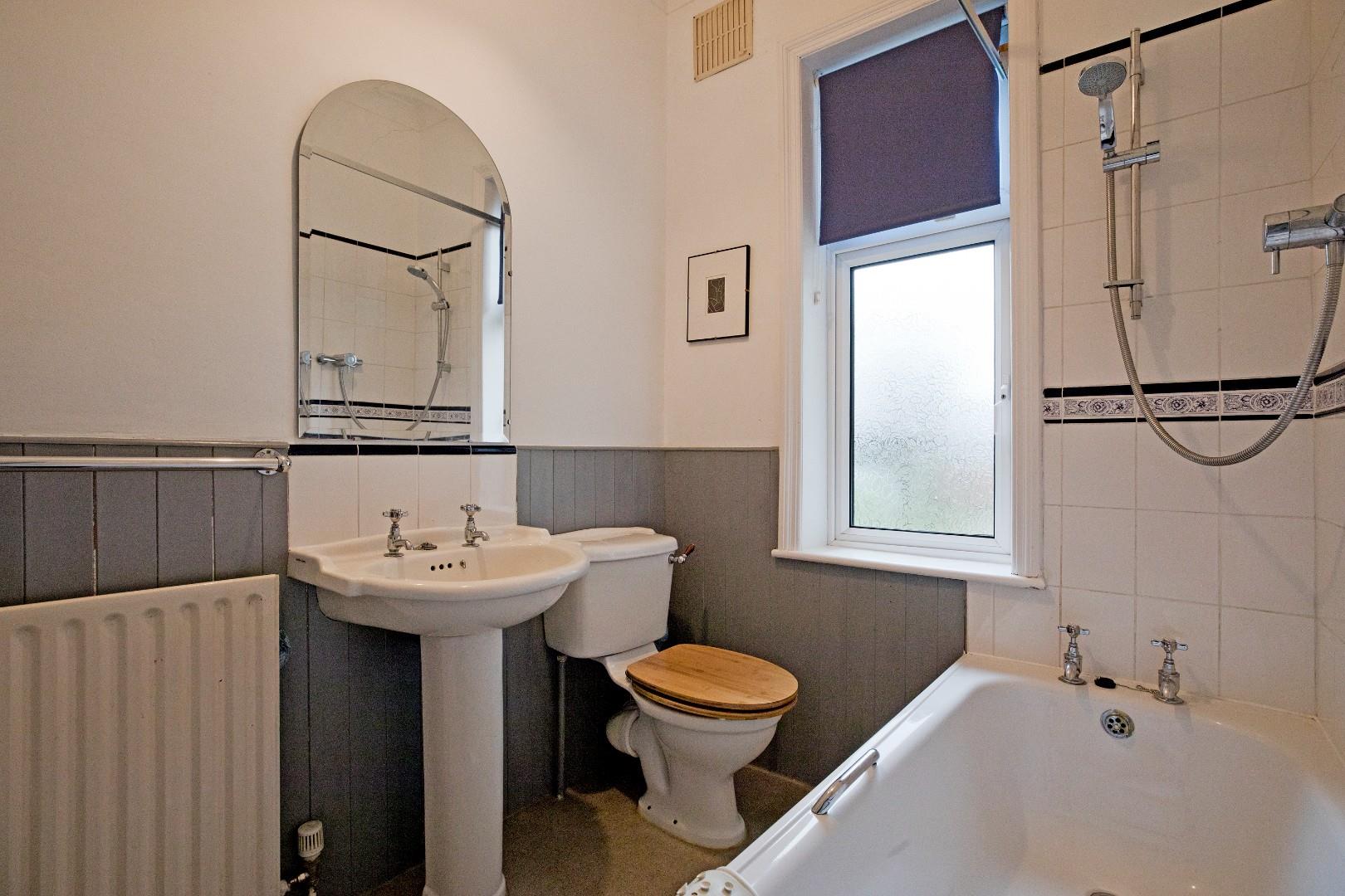 A three-piece house bathroom with low level W.C., pedestal handbasin with traditional style chrome taps, tiled splashback, wall mirror and panel bath with thermostatic shower and chrome taps. Obscure, double glazed window to rear, vinyl flooring, radiator.