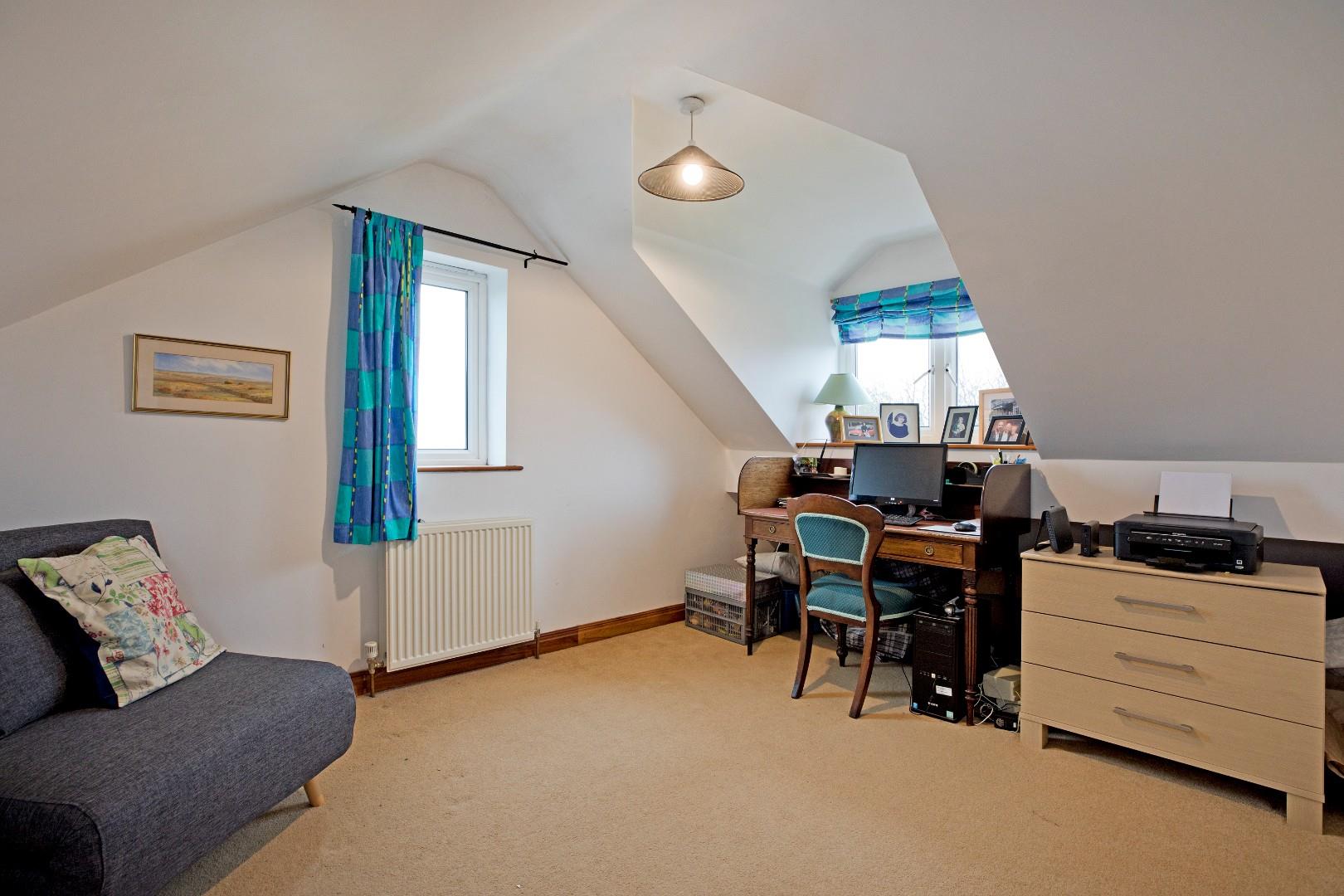A second, dual aspect, double bedroom, currently arranged as a home office, with carpeted flooring, radiator and delightful, far reaching views.