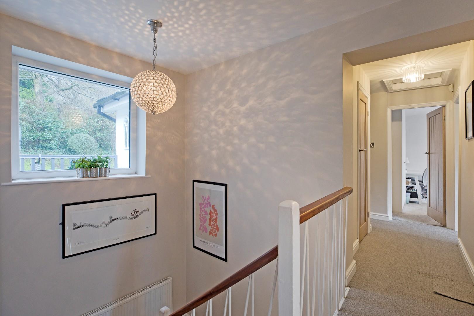 A return, carpeted staircase with radiator and double glazed window to the half landing leads to the first floor of the property. Smart, oak panelled doors open into five bedrooms and the spacious house bathroom. There is a useful cupboard with shelving and radiator providing storage. A hatch gives access to the loft area.