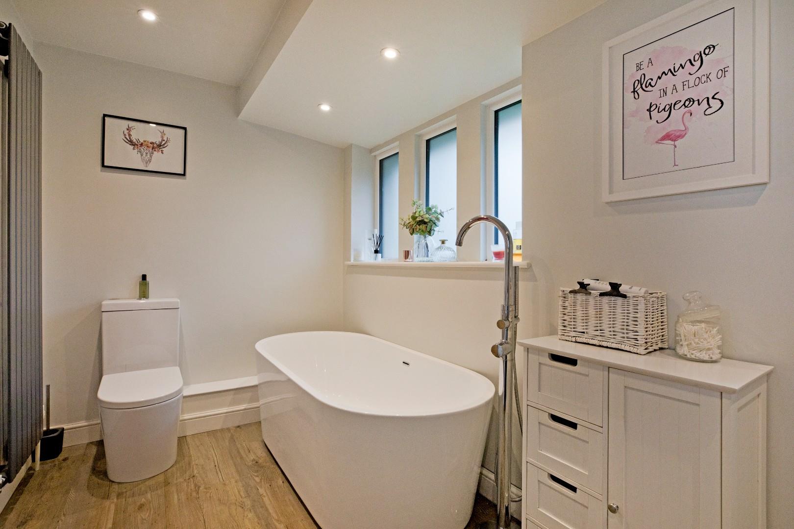 A great sized family bathroom with low-level W.C., pedestal handbasin with chrome mixer tap with mirrored vanity unit over with lighting and tiled splashback and deep-fill bath with freestanding, chrome mixer tap and shower attachment. Large, walk-in shower cubicle with thermostatic drench shower plus additional attachment and wall mounted controls. Extractor, recessed ceiling lights and three, double glazed windows to the front of the property. High-quality, wood effect flooring, contemporary styled, grey, vertical radiator.