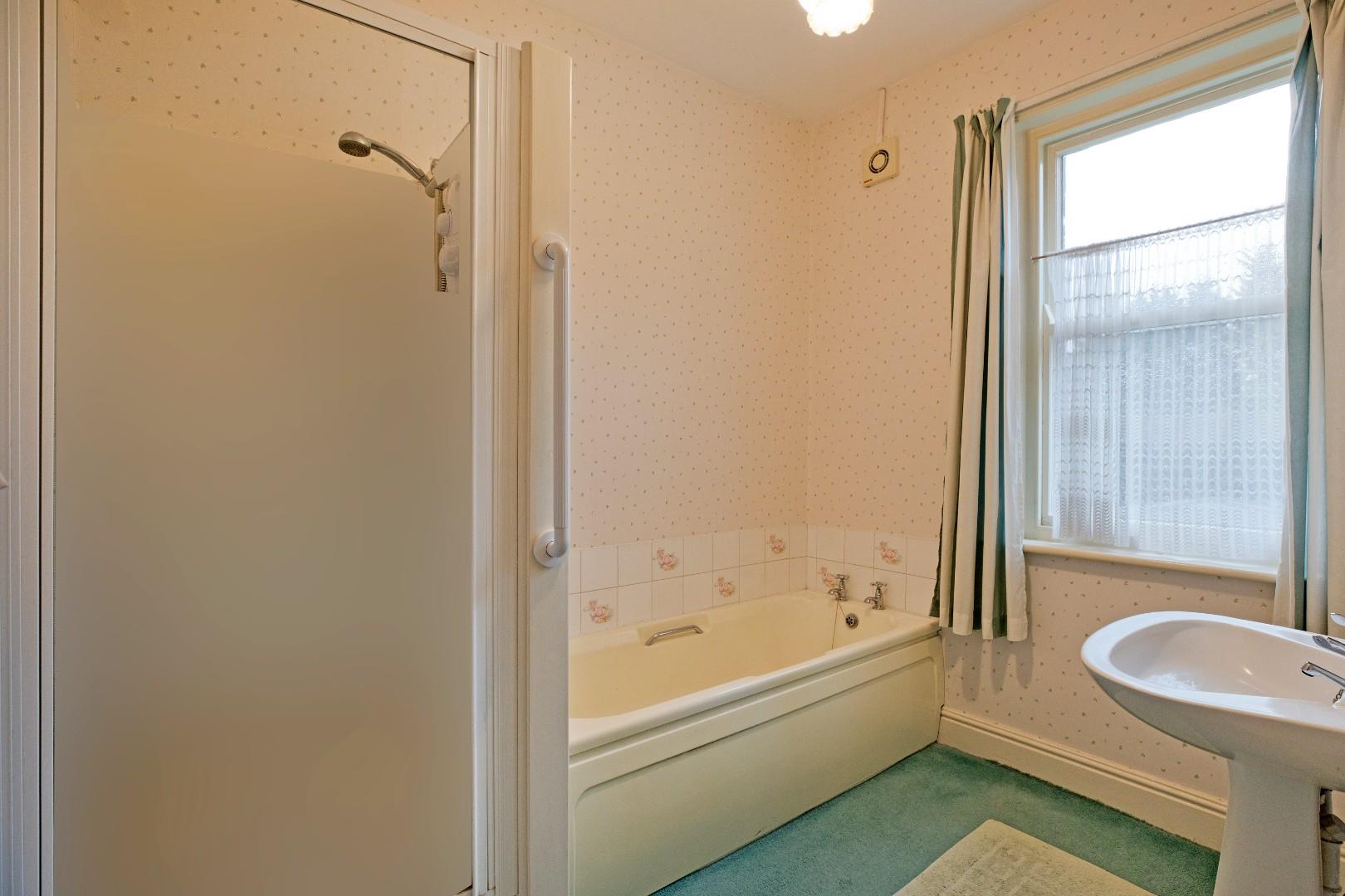 With pedestal handbasin with chrome taps and panel bath with wall tiling. Shower cubicle with thermostatic shower, carpeted flooring, useful airing cupboard with shelving housing the hot water tank. Window to rear, radiator, extractor.