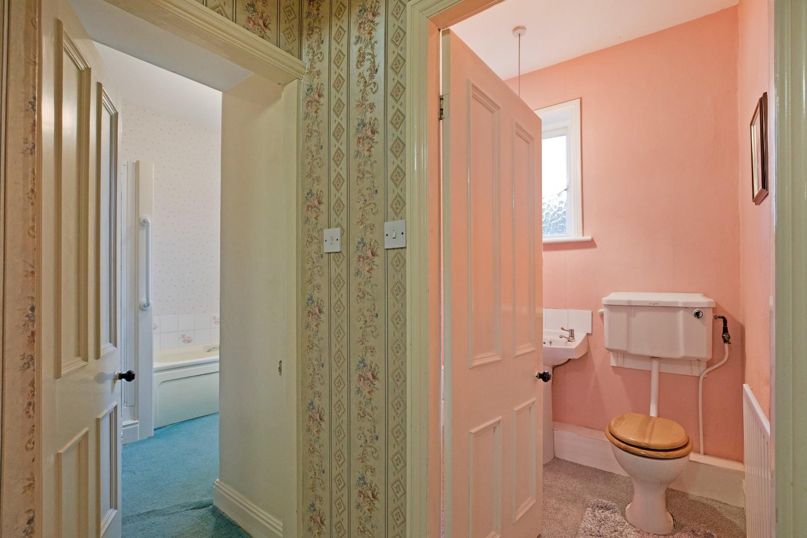A carpeted staircase with attractive, timber balustrading leads to a long landing area on the first floor of the property. To the rear one finds a small double bedroom, separate toilet and bathroom. A short set of carpeted stairs continues to a landing area to the front of the house with doors opening to three bedrooms, two being generous doubles. A lantern light is a delightful, original feature allowing natural light.