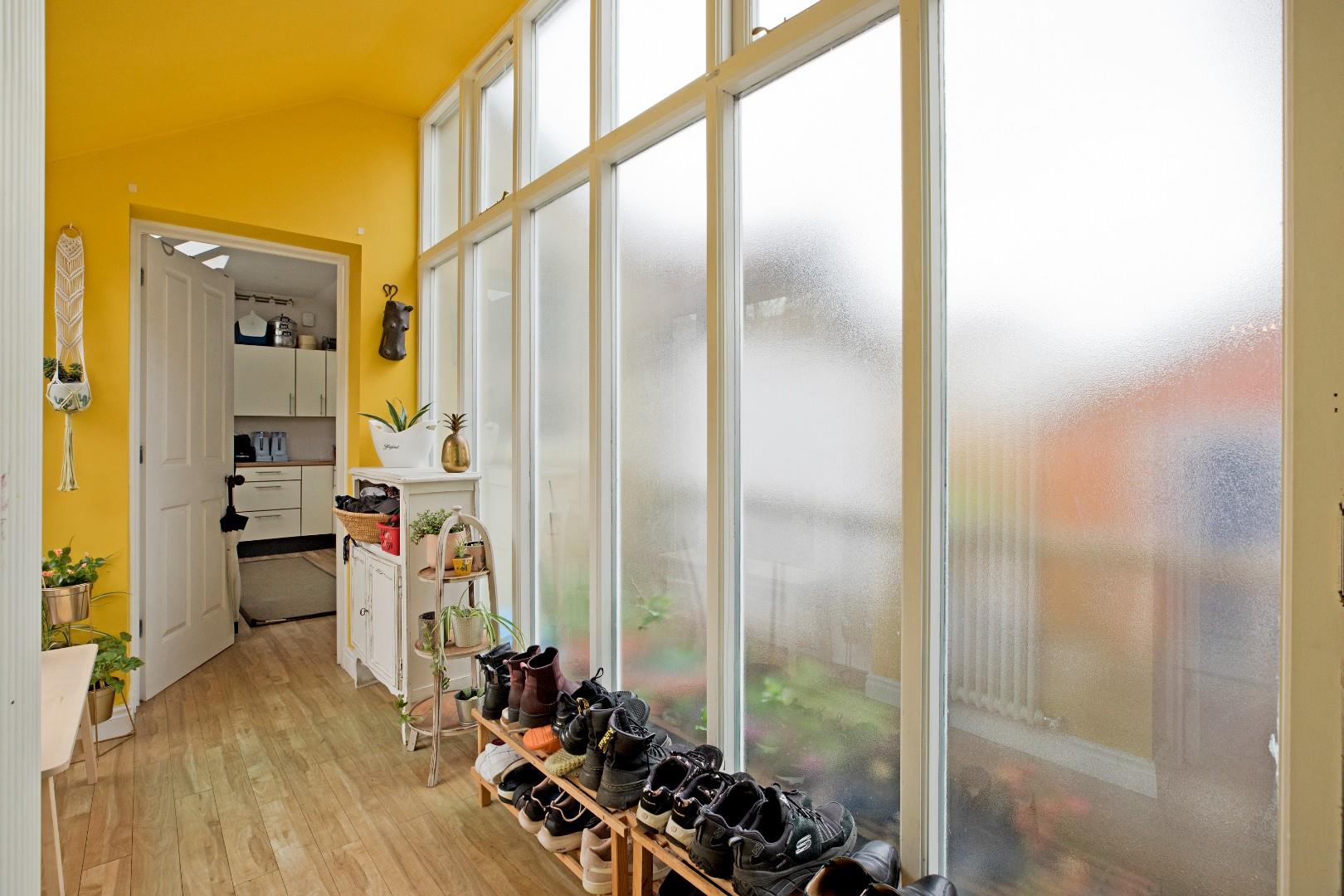 A composite door with attractive, etched, leaded panel is an ideal way to arrive home after a walk in the surrounding countryside as it provides entrance into the good-sized boot room with practical flooring and space to hang coats and store shoes. A bank of tall, opaque glazed windows makes for a bright atmosphere. A fully glazed door with adjacent glazed side panels leads out into the rear garden. A door opens into: