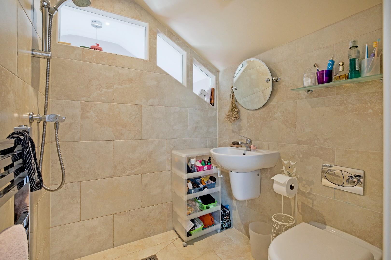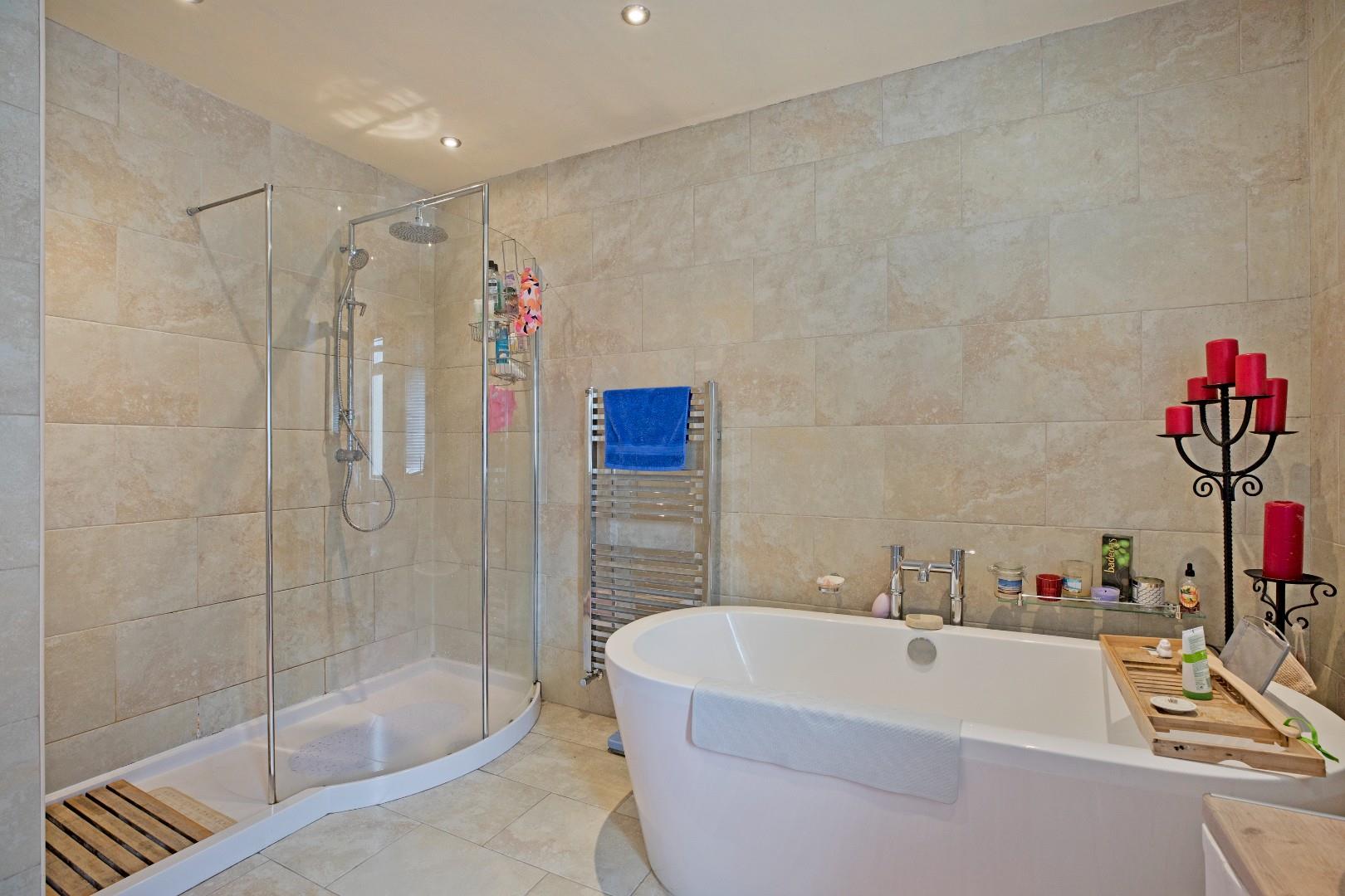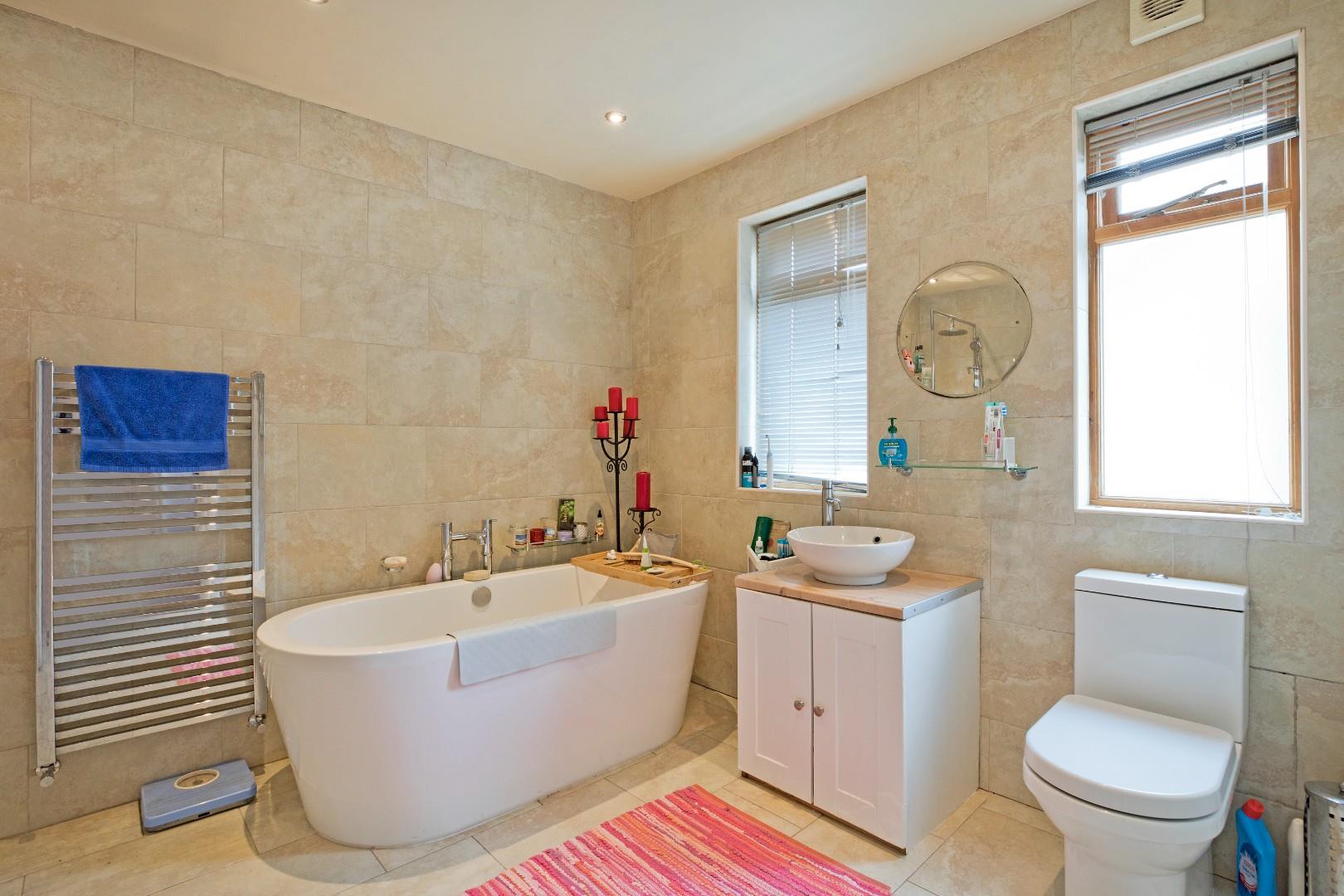 A beautifully appointed, four-piece, contemporary house bathroom of an excellent size. Fitted with a freestanding, deep fill bath with monobloc tap, a circular washbasin with monobloc tap sitting on a vanity unit comprising of a double cupboard, a low-level w/c and a large walk-in shower with glazed screen and mains shower with separate hand-held shower attachment. Fully tiled to the walls and floor. Two windows to the side elevation allow for ample natural light. Chrome, ladder, towel radiator, downlighting and extractor fan.