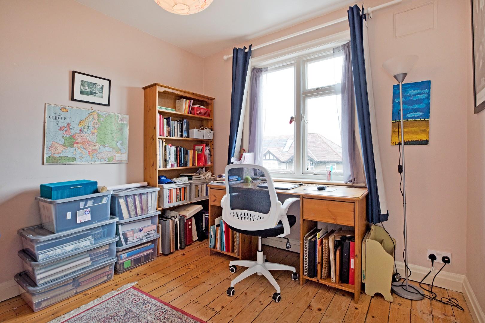 A fourth, double bedroom to the front elevation, currently used as a study. A window affords pleasant views. Stripped flooring and radiator.