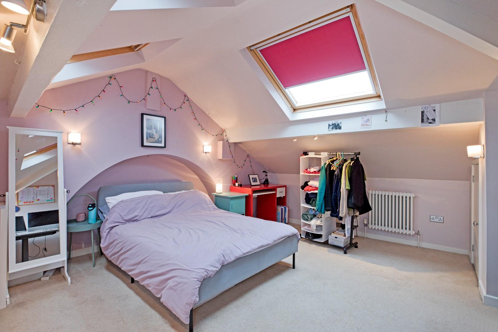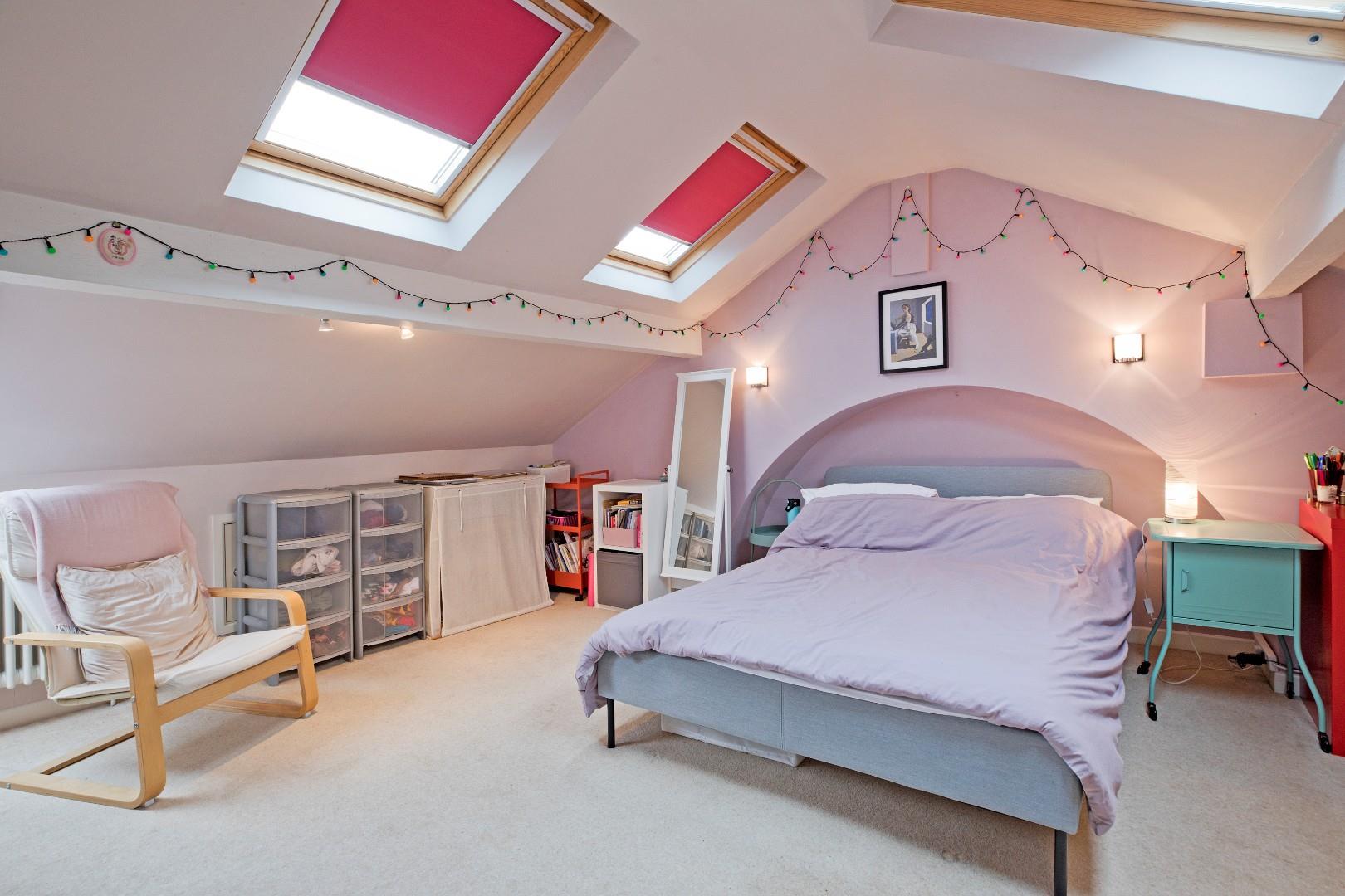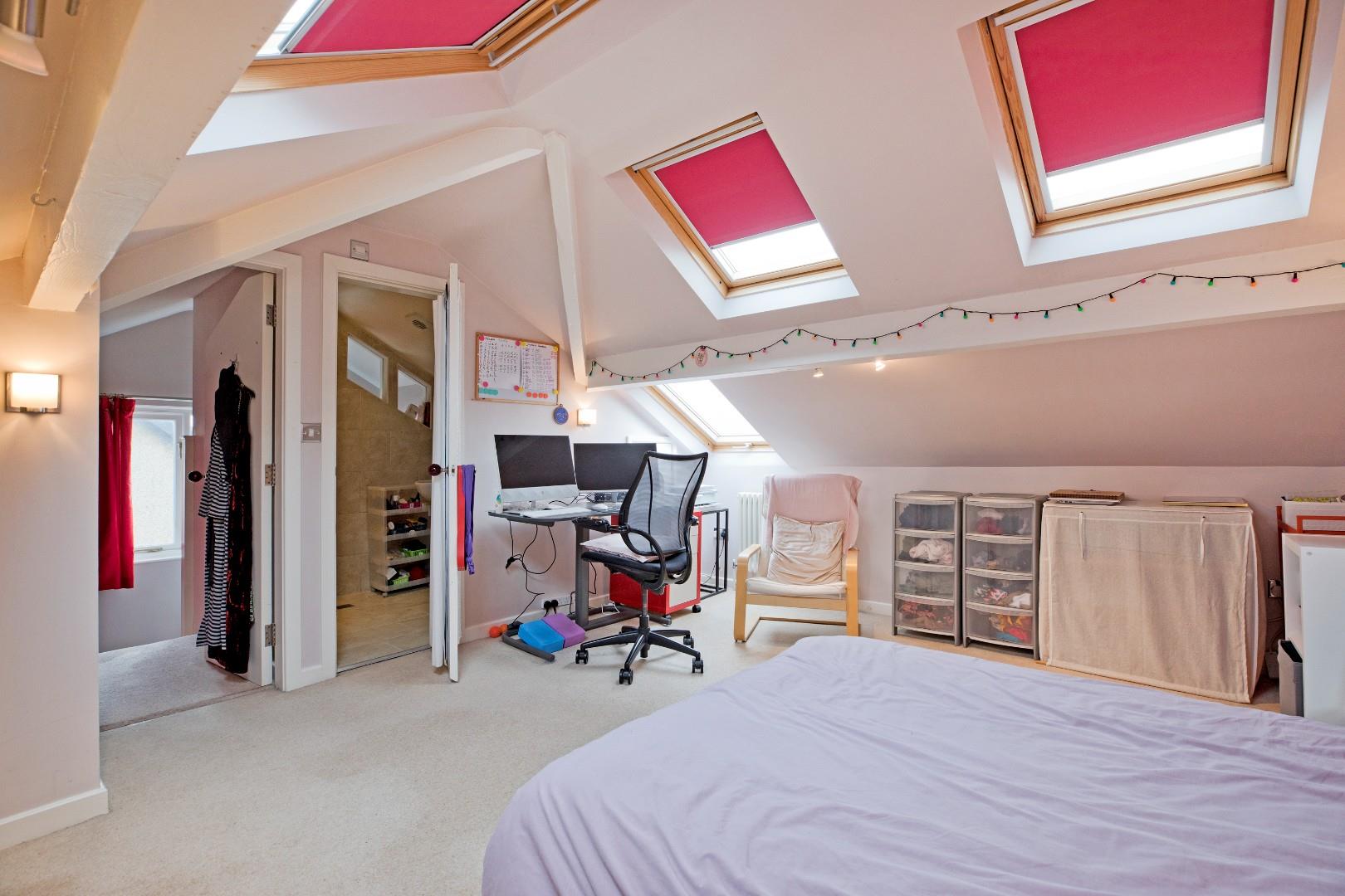 A spacious, double bedroom - an oasis of peace and calm. Four Velux windows allow for ample natural light. Two traditional style radiators and carpeting. Under eaves storage to both sides of the room. A doorway opens into:
