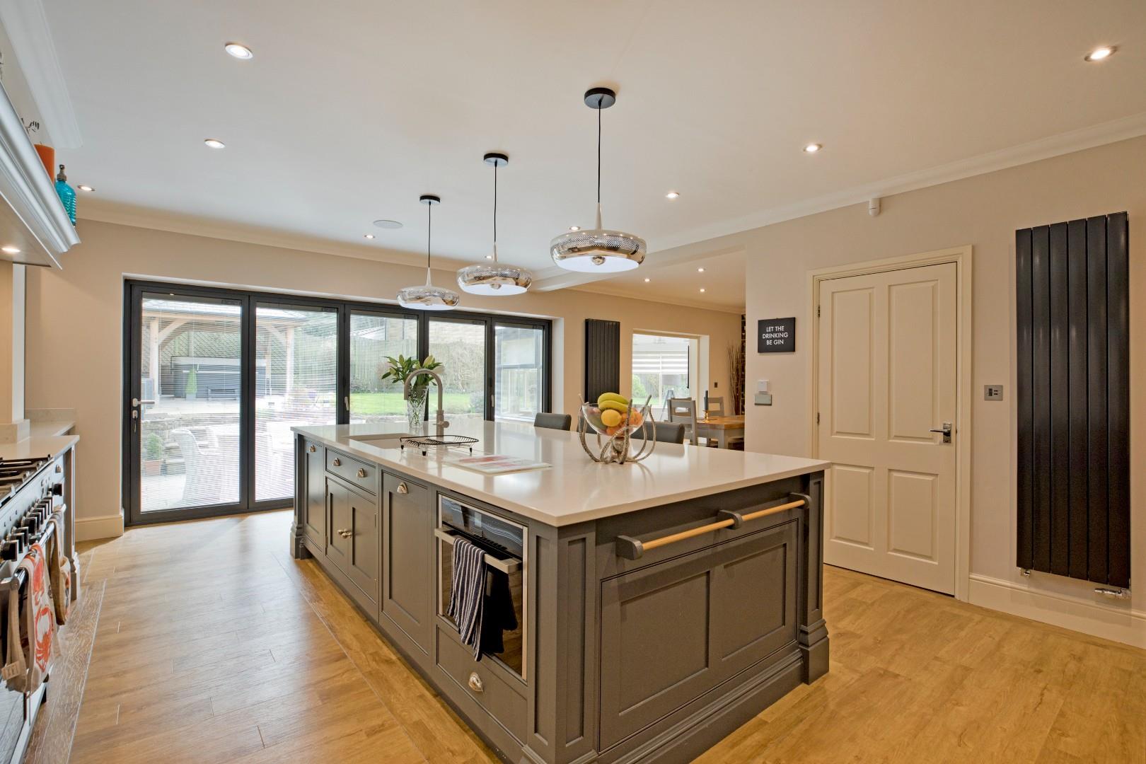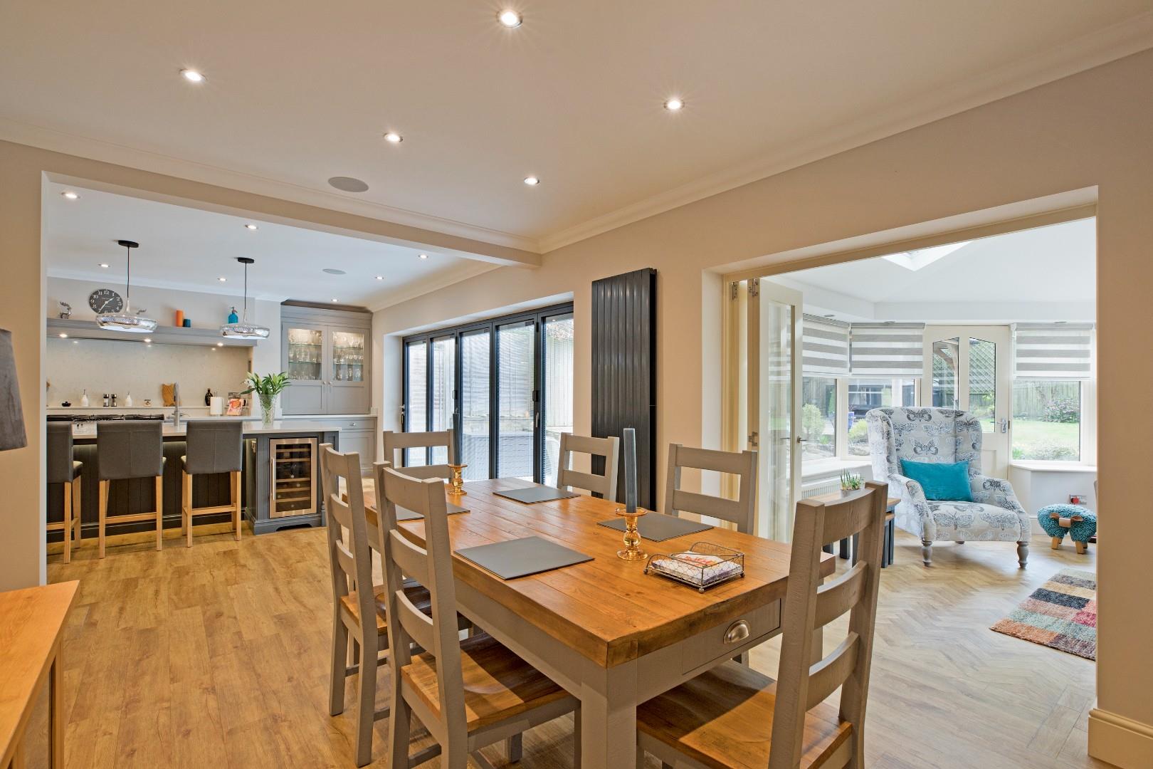 This absolutely stunning living dining kitchen is a fabulous entertaining space. Beautifully appointed with bespoke kitchen units from Tom Howley providing plentiful storage in deep drawers and cupboards including a fabulous, pantry style, breakfast station with double doors, this kitchen exudes a wonderful charm all of its own! A large central island with breakfast bar seating is a great spot to congregate with a glass of wine or a coffee and houses further storage. Complementary quality worksurfaces and upstands over. High end, Neff integrated appliances include a dishwasher, an electric oven and a coffee machine. A Professional Deluxe Rangemaster oven with five burner gas hob and warming plate takes centre stage with recessed shelving to each side and extractor fan and charming mantle over. Two wine fridges, Samsung American style fridge/freezer and integrated waste bins. Inset one and a half bowl, ceramic sink with Quooker tap. Schuco bifold doors with electric blinds to the rear elevation open onto the large south facing patio, conducive to al fresco dining and entertaining in the warmer weather. Herringbone style Karndean flooring with electric underfloor heating. The dining living area has ample room for a large family dining table or seating and a smaller table depending on personal preference. Coving, downlighting and two contemporary , vertical radiators. Bi-fold glazed timber doors open into the garden room.