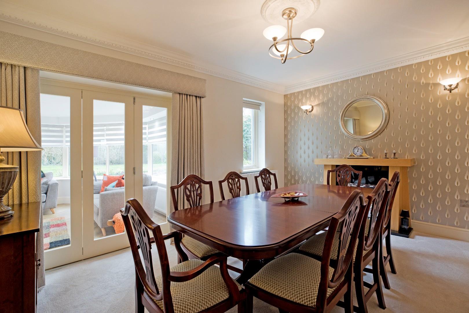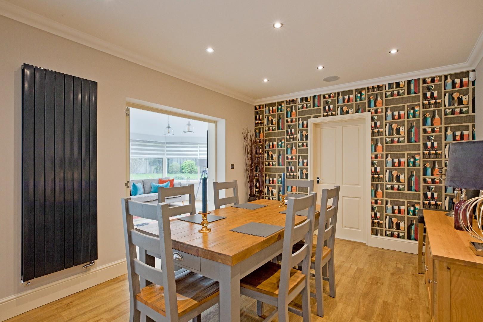 Currently serving as a formal dining room, this could also serve as a further sitting room or even a study should one wish. A lovely, modern style, timber fire surround with granite hearth houses a coal effect, gas fire. A window affords a pleasant aspect over the rear garden. Decorative cornice and ceiling rose, carpeting and radiator. Space for a large, family dining table. Timber, bi-fold doors, enhance the versatility and flow of the living space opening into: