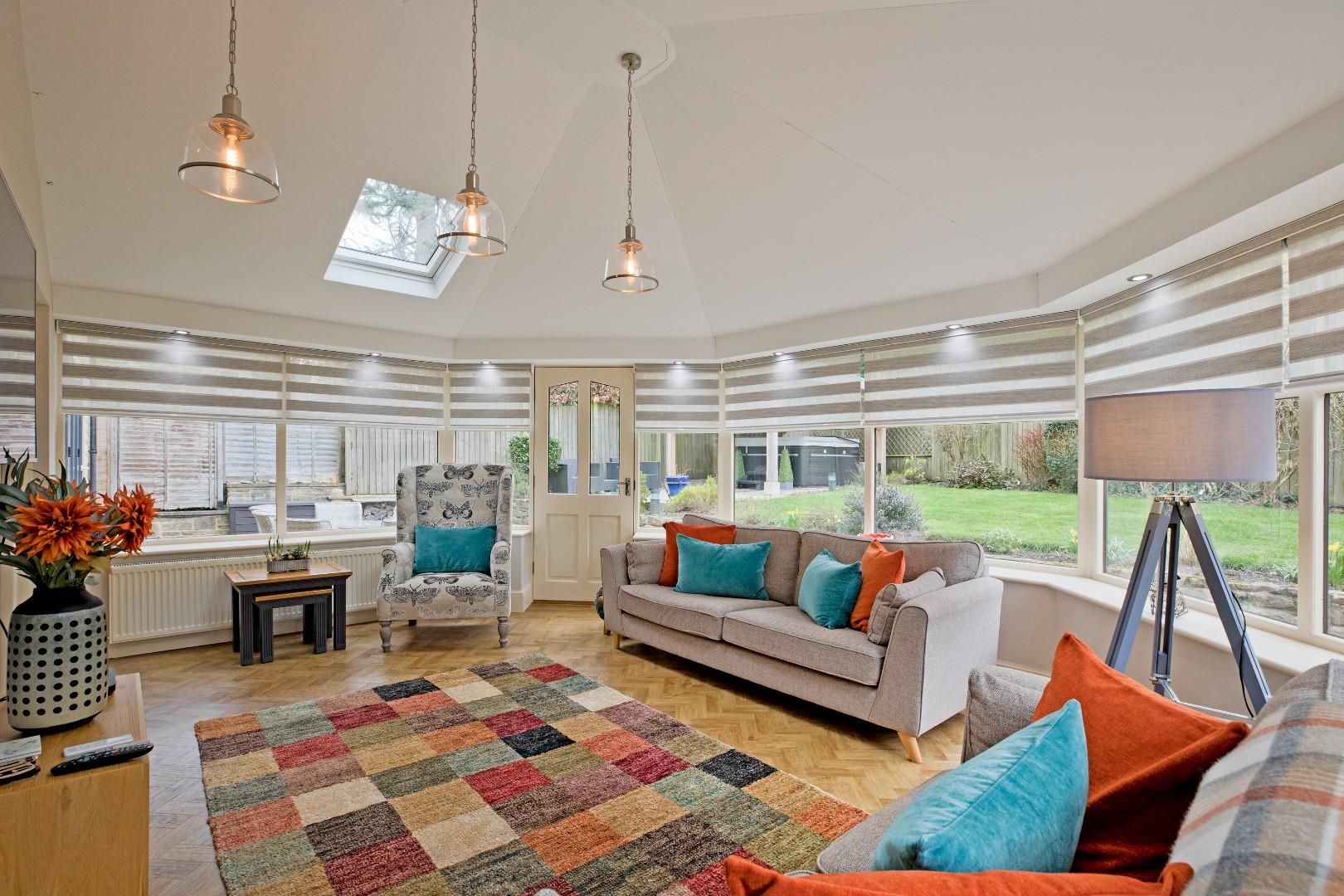 A fabulous addition to the already generous living accommodation, this wonderful, spacious garden room can be used all year round, making the most of the enjoyment of the lovely garden throughout the seasons. With ample room for sofas and armchairs, this is a lovely environment in which to entertain or simply relax with a cup of tea and a good book. Two Velux windows accentuate the bright atmosphere. Herringbone style Karndean flooring, bespoke electric blinds to the timber framed windows, two radiators, downlighting and TV point. A half-glazed, timber door opens onto the south facing patio.