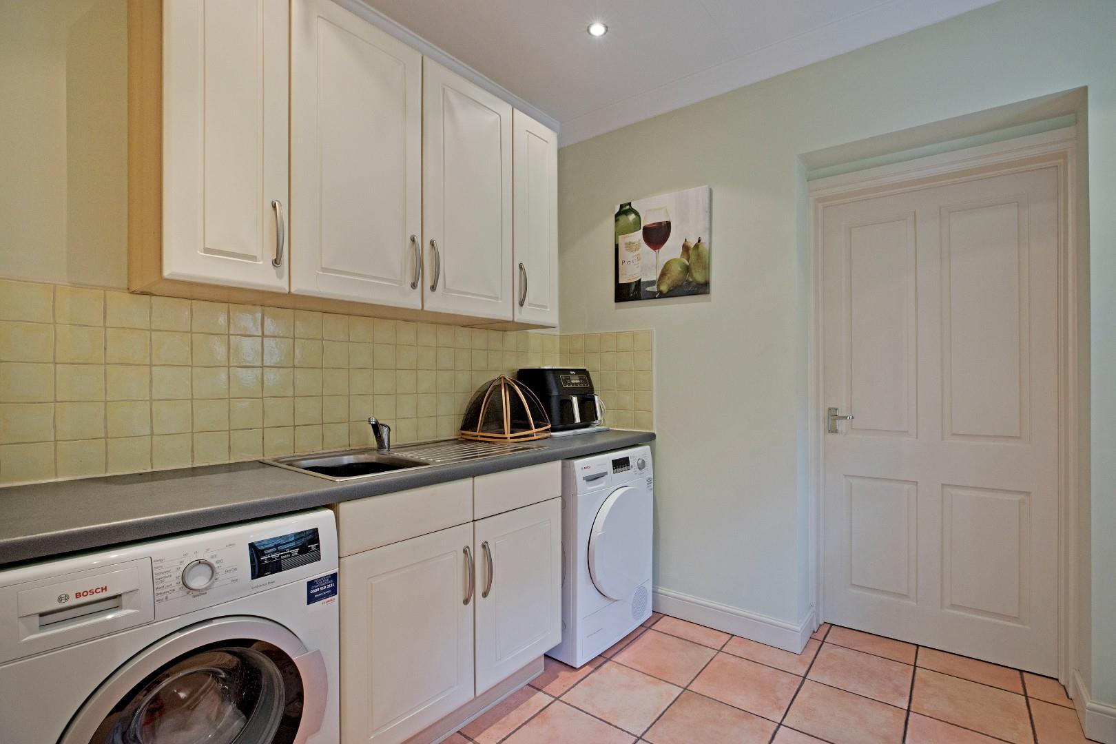 A doorway from the kitchen leads into a spacious utility room. Fitted with modern base and wall units with tiled splashback and contrasting laminate worksurface over incorporating a stainless-steel one and a half bowl sink with monobloc tap and draining board. Space and plumbing for a washing machine and tumble dryer. Coving, downlighting, practical, ceramic, tiled flooring, radiator and extractor fan. A half-glazed door and side window.
