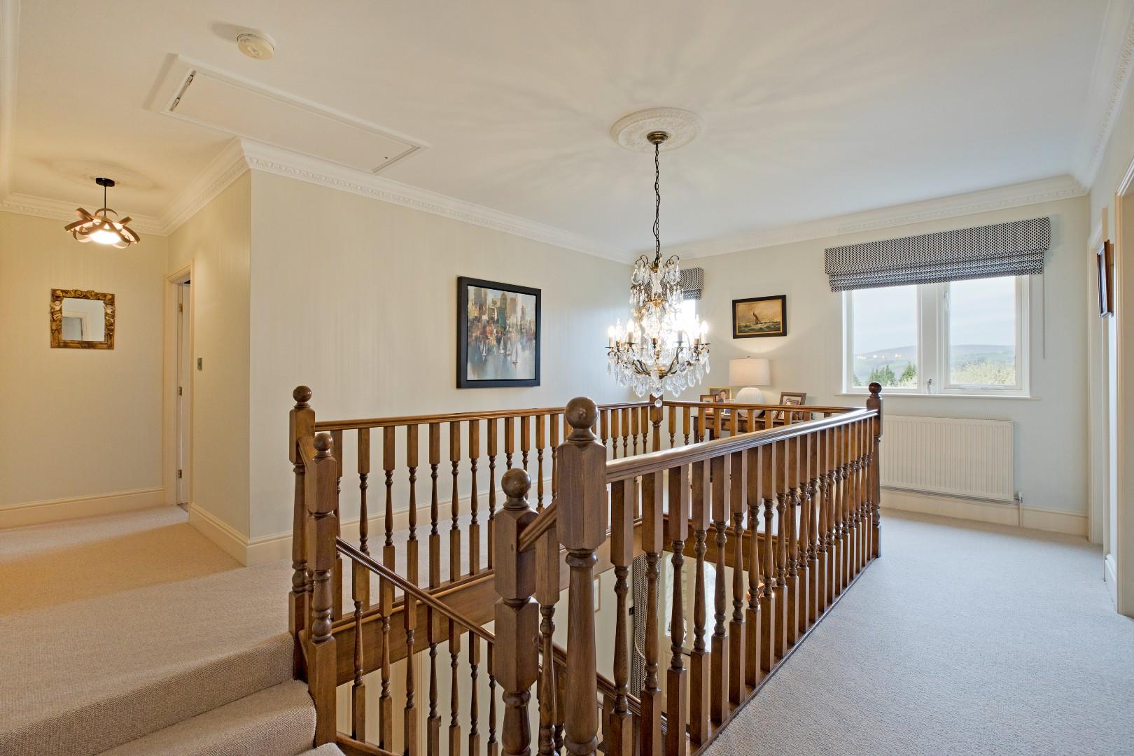 A carpeted staircase with polished wooden spindle balustrading leads up to the first floor galleried landing. with room for several items of furniture if desired. A large window to the front elevation allows lots of natural light and affords spectacular, far reaching countryside views. Carpeted flooring, radiator. Doors open into five bedrooms, three of which are served by en suites, the family bathroom and a cupboard housing the hot water tank. A loft hatch with fitted ladder provides access to a great-sized, boarded loft with light.
