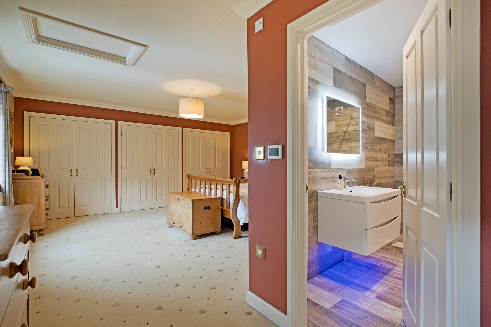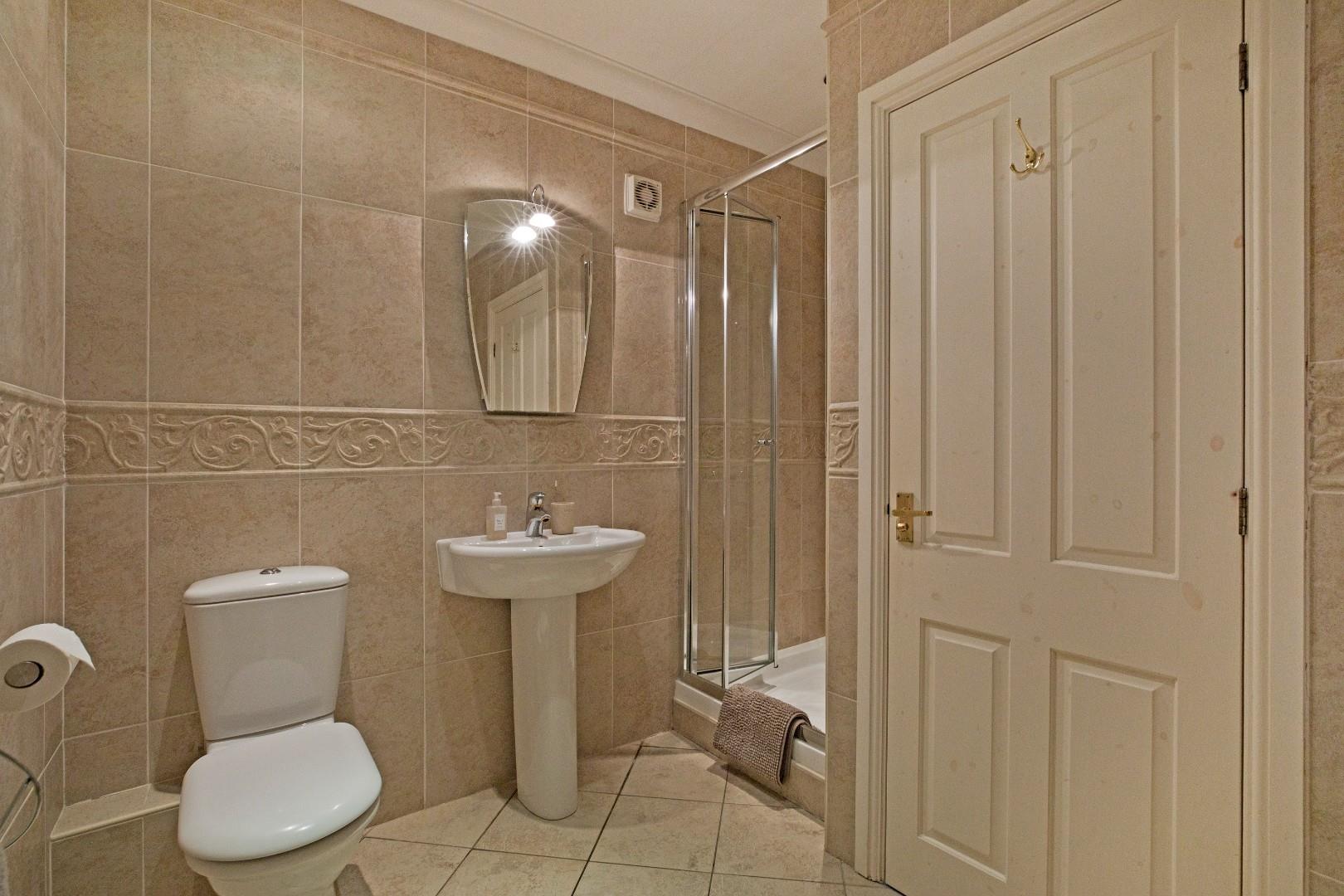 Fully tiled with pedestal hand basin, shower cubicle with mains shower and sliding glazed door. Low-level w/c. Radiator, extractor, coving, downlighting and illuminated wall mirror. Obscure, double glazed window.