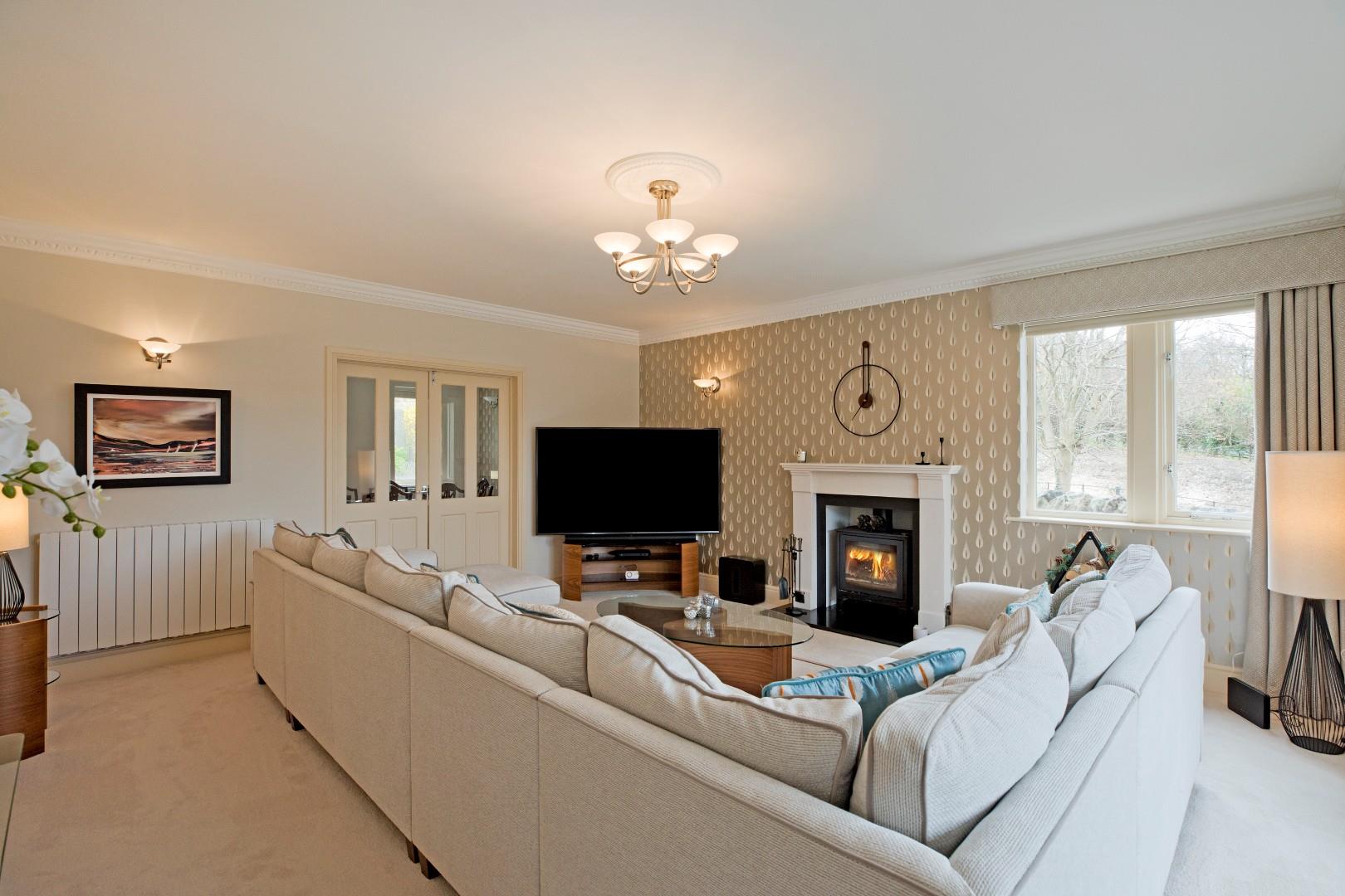 A beautifully presented room of generous proportions. A large bay window to the front of the property affords a view towards the magnificent Wharfe Valley countryside and allows for ample natural light supported by two further windows to the side elevation. An elegant, cream stone fireplace with black hearth housing a Jetmaster log burning stove creates a fabulous, focal point to this room. Decorative cornicing and ceiling rose lend character. Carpeted flooring, TV point, wall lights and two radiators. Double, half-glazed doors open into: