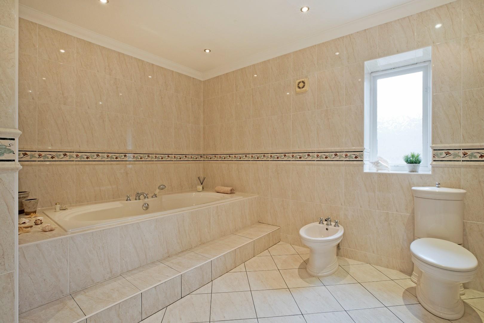 Incorporating an inset sunken bath, a corner shower cubicle with mains shower, separate hand held shower attachment and sliding glazed doors, a pedestal washbasin, a bidet and a low-level w/c. Traditional style taps, fully tiled to the walls and floor, downlighting, coving, vertical, ladder style radiator and a second radiator, wall mounted mirror and extractor fan. Window with obscure glazing to the side elevation.