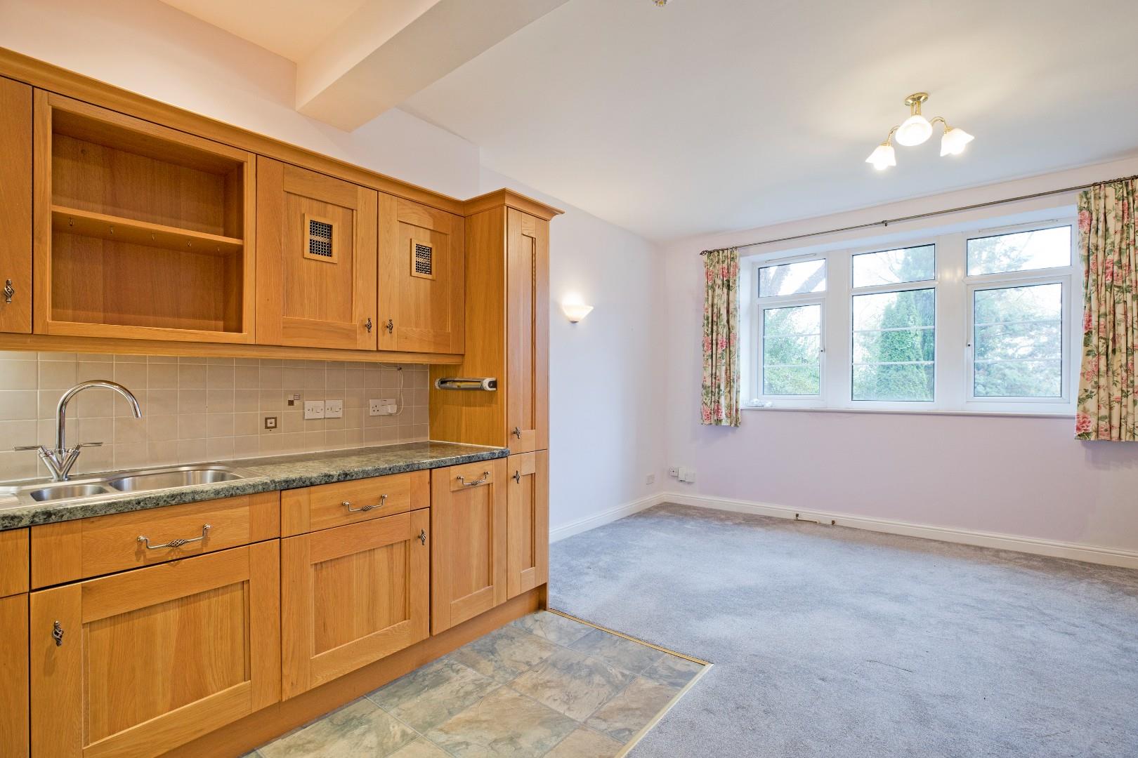 A lovely, spacious room with attractive, solid wood cabinetry with under cabinet lighting, metal handles, complementary worksurfaces and tiled splashbacks. Integrated appliances include electric oven, four ring electric hob with extractor over, microwave, under counter fridge and slimline dishwasher. Downlighting, tile effect, vinyl flooring. Open to a lovely, light sitting area with carpeted flooring and large, double glazed windows with a lovely leafy aspect and glimpses across Ilkley. Slimline electric radiator, ample space for comfortable furniture here.