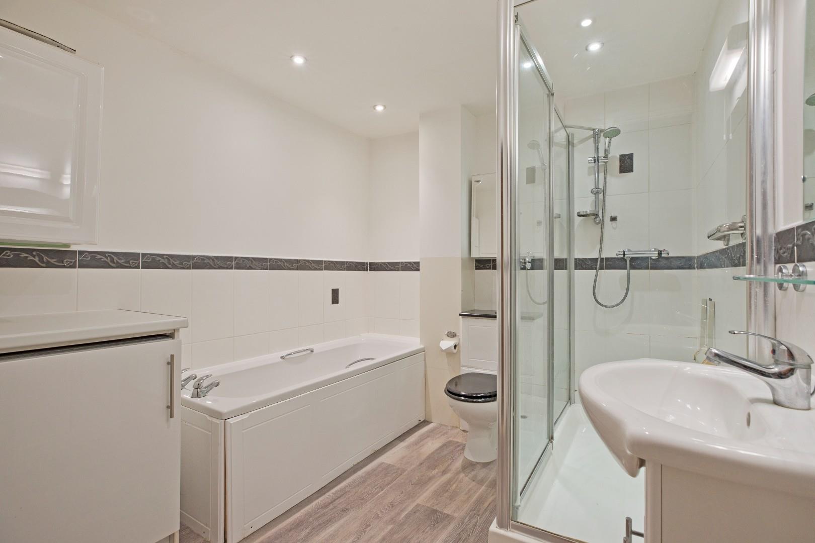 A great sized, four-piece bathroom with low-level W.C. with concealed cistern, handbasin with chrome mixer tap set in a vanity cupboard with wall mirror and light over and panel bath with chrome taps and tiled surround. Large, separate shower cubicle with thermostatic shower, white wall tiling and folding, glazed door. Wall mounted cupboard in addition to a mirrored vanity cupboard and integrated washer dryer. Chrome, ladder style, heated towel rail, wood effect vinyl flooring, downlighting, extractor.