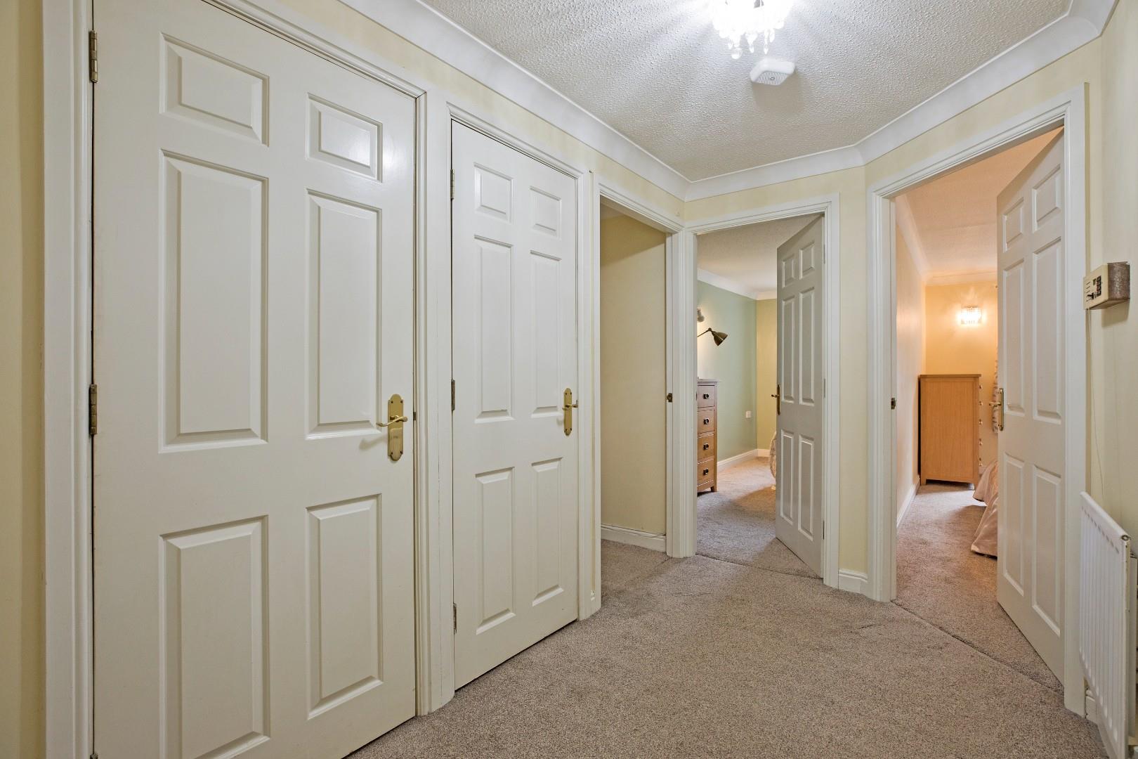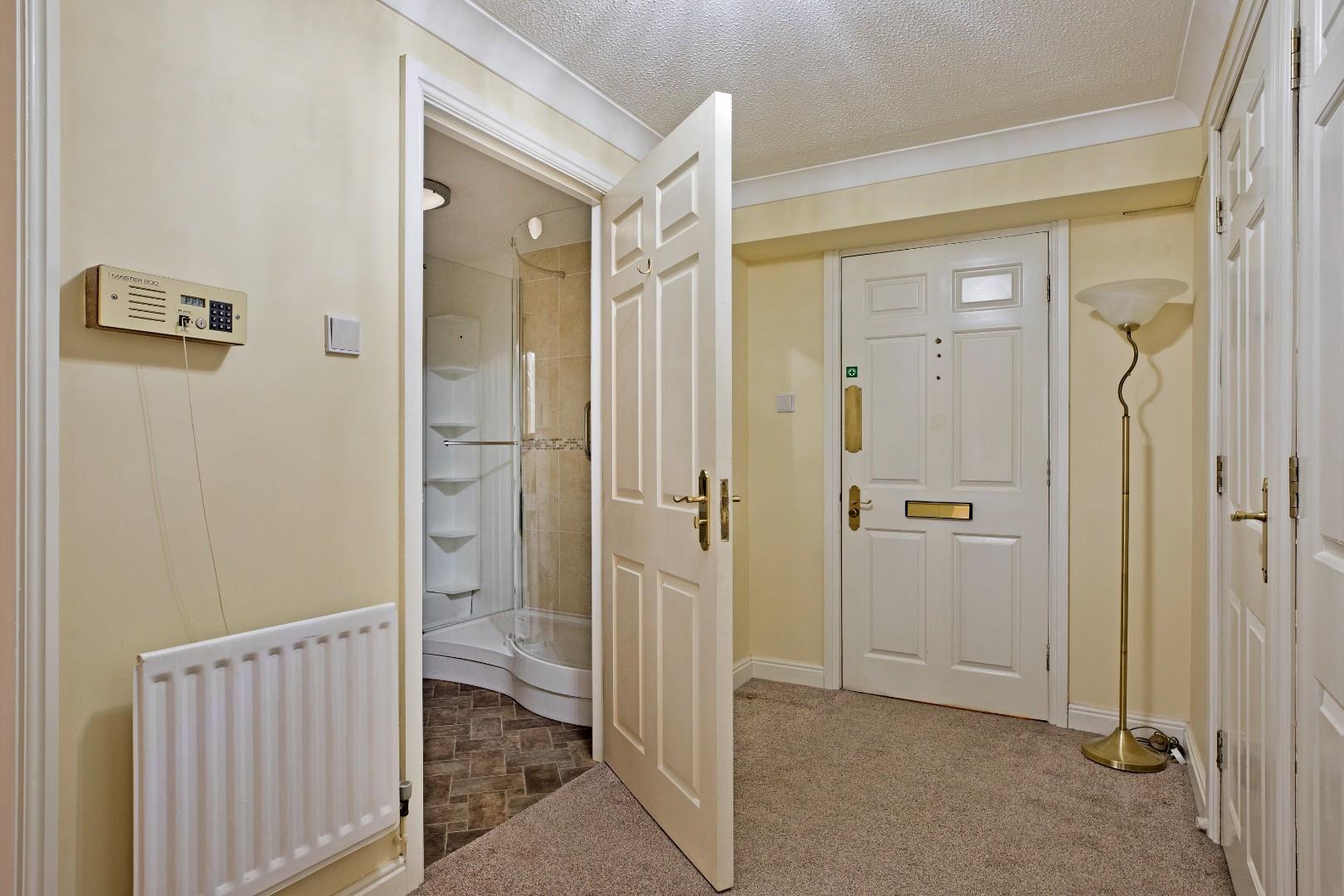 A covered entrance with secure double doors opening into the communal entrance hall. Stairs and lift lead to the upper floors. Access to residents' lounge, kitchen and laundry room.