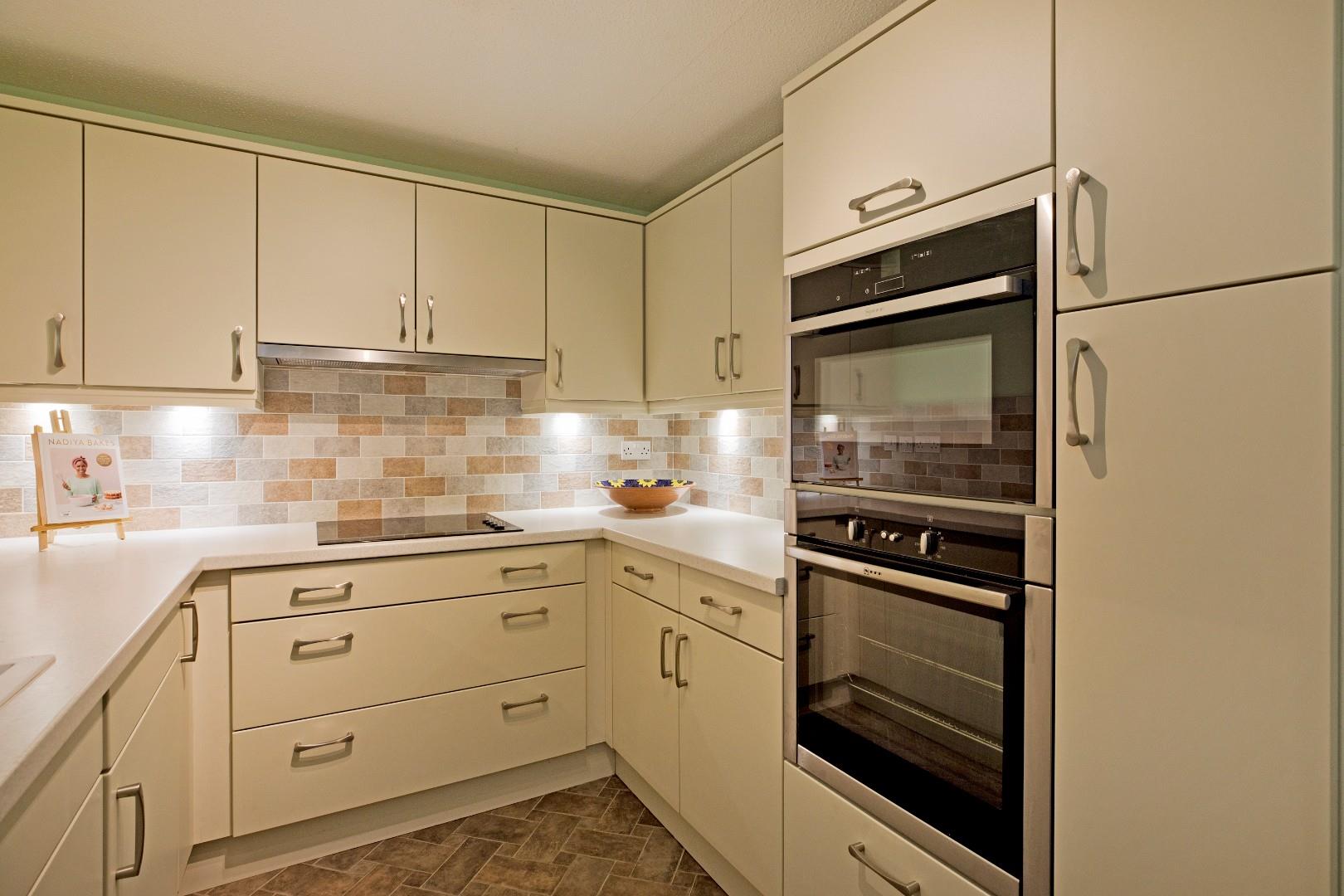 A very well presented modern kitchen fitted with a range of cream coloured base and wall units with stainless steel handles, complementary laminate worksurfaces and attractive metro tiling to splashbacks. Integrated appliances include two, Neff electric ovens, fridge/freezer, dishwasher and four ring electric hob with extractor over. Inset sink and drainer with chrome mixer tap. Tile effect vinyl flooring, ceiling lights.