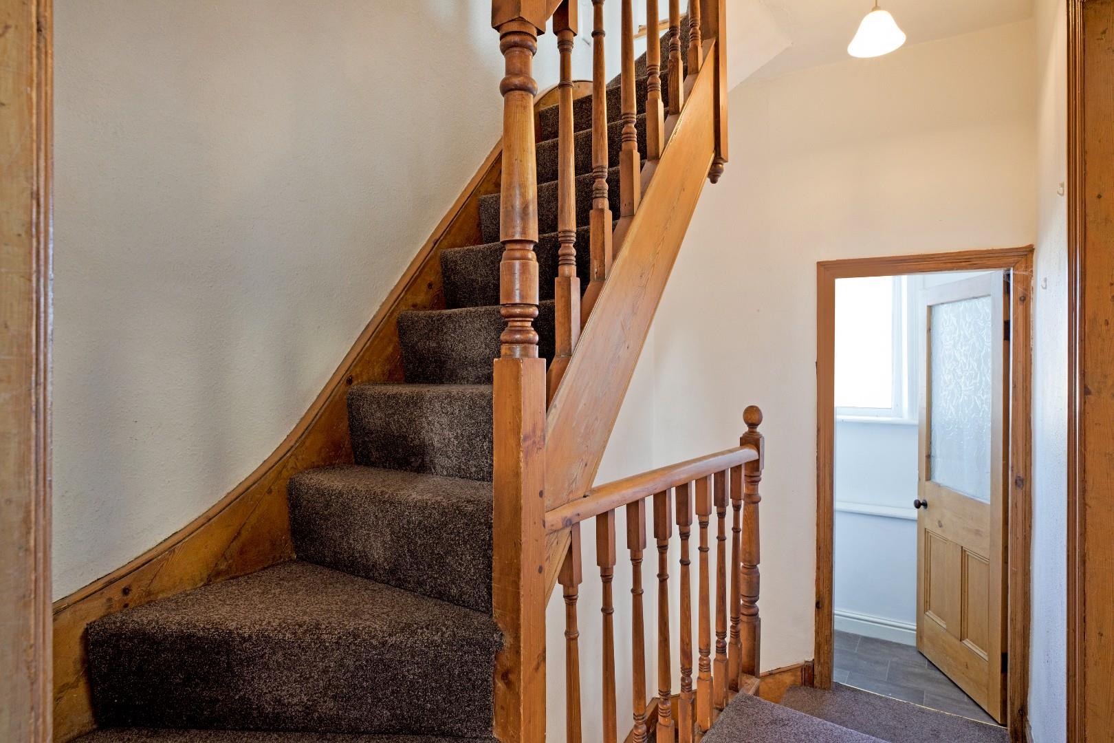 A return, carpeted staircase with timber balustrading leads to the second floor landing, where doors open into two, further bedrooms.