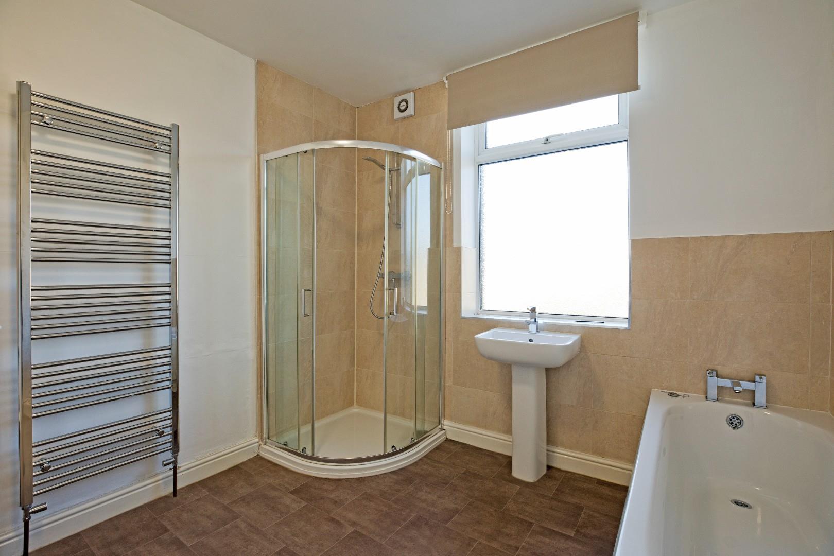 A spacious, three-piece house bathroom with low pedestal handbasin with chrome mixer tap and panel bath with central mixer tap. Corner shower cubicle with thermostatic shower, curved, glazed screens and neutral wall tiling. Tall, chrome, ladder style heated towel rail, extractor, radiator. Wood effect vinyl flooring, obscure double glazed window to rear.