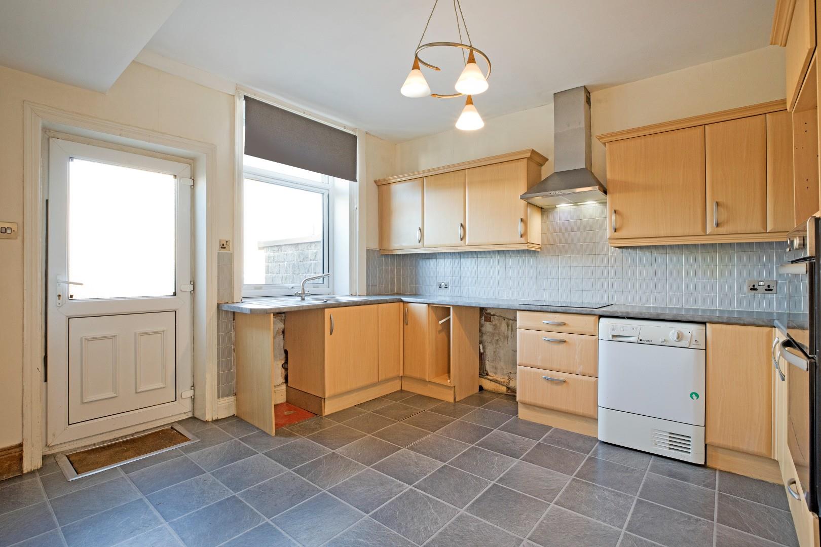 A good sized dining kitchen fitted with a range of pale wood effect cabinetry with stainless steel handles, complementary worksurfaces and tiled splashbacks. Appliances include electric oven and grill and electric hob with stainless steel extractor over. A stainless steel sink and drainer with chrome mixer tap sits beneath a double glazed window to the rear. Space and plumbing for undercounter appliances, slate effect, laminate flooring, chrome, ladder style radiator. There is ample space for a family dining table. A half obscure glazed, uPVC door leads out to the rear, courtyard garden. Door into a most useful storage area housing the newly installed, gas central heating boiler with 10 year guarantee. One could develop this space to create a pantry, utility room or even a downstairs cloakroom / W.C.
