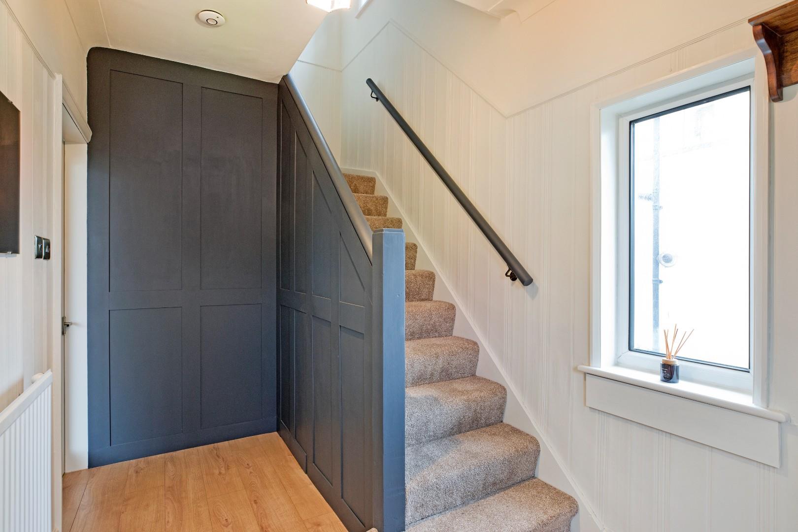 A part obscure glazed uPVC entrance door opens into a welcoming entrance hall with laminate flooring, radiator and space for an item of furniture. Double glazed window to side elevation, attractive panelling with a recessed, understairs cupboard providing a good amount of storage.