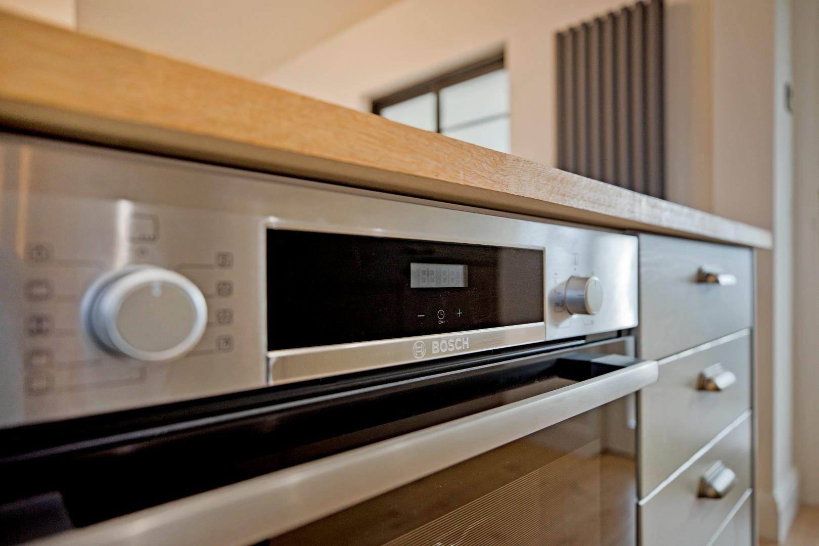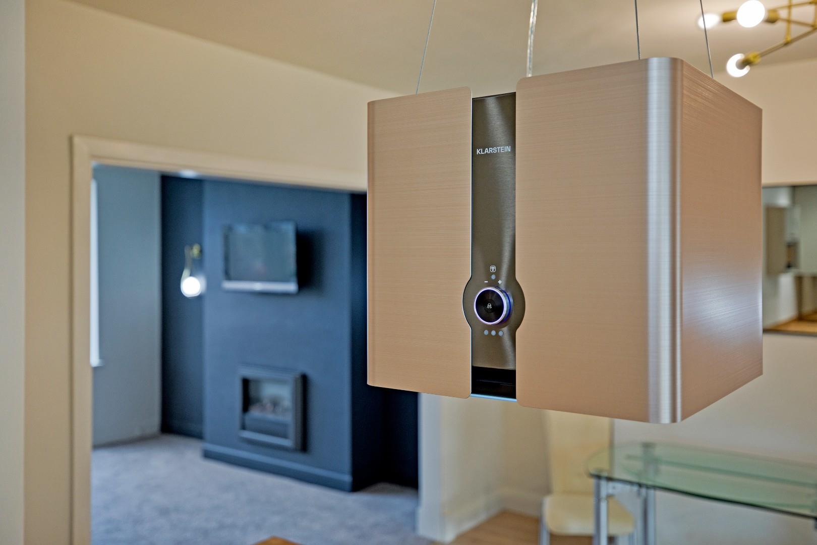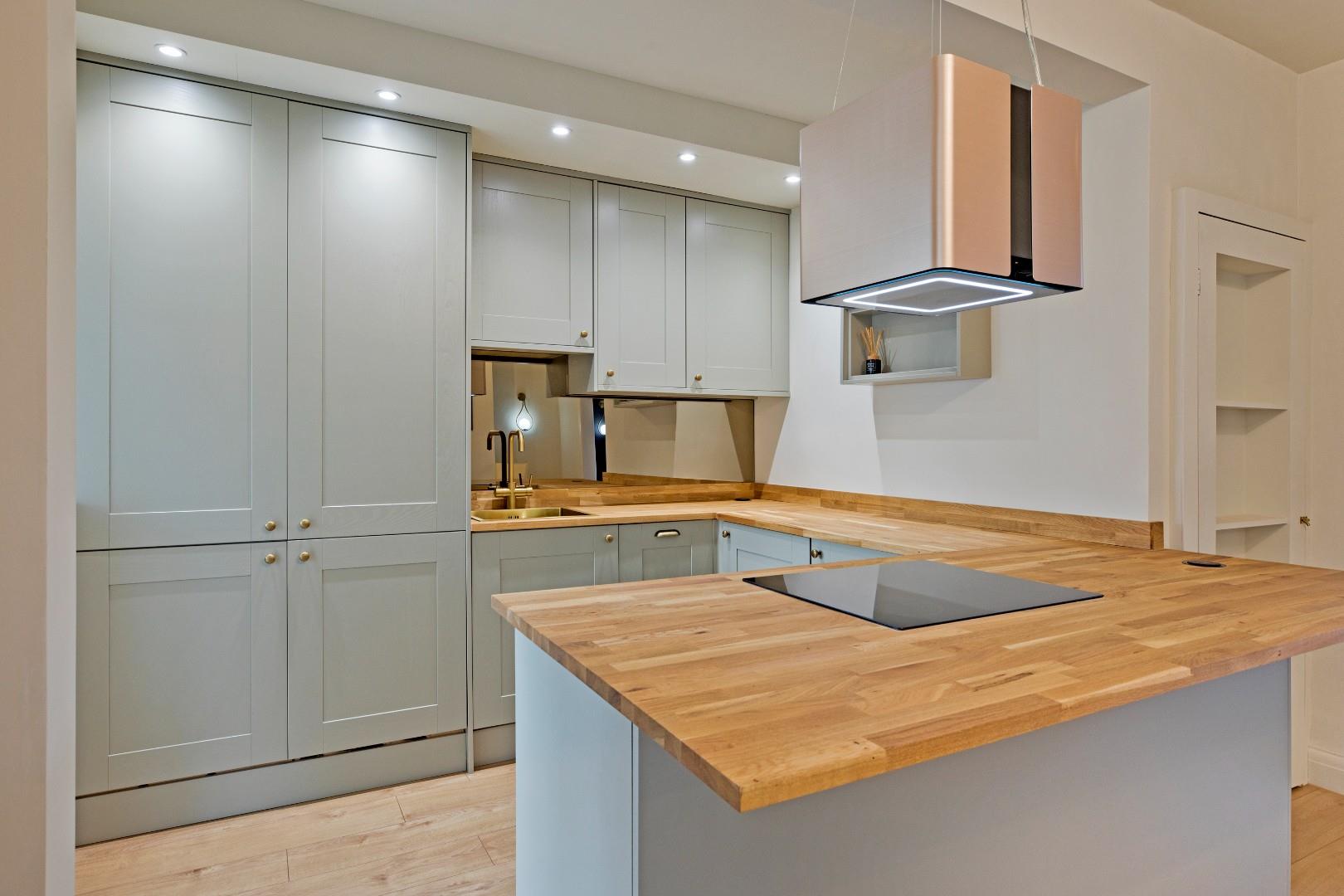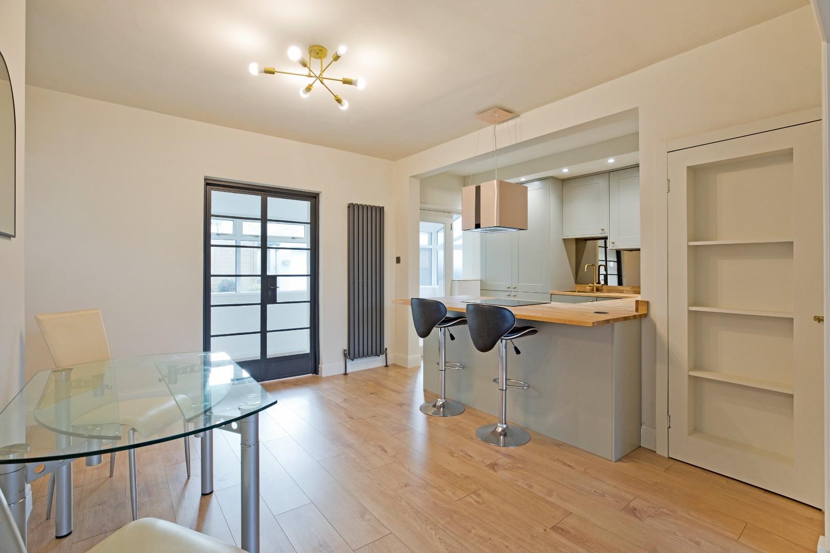 A beautifully presented, light and airy dining kitchen fitted with a range of soft grey Shaker style cabinetry with brushed copper handles with solid wood worksurfaces and upstands, incorporating a handy breakfast bar, and with attractive, darkened glass splashback. Inset, brushed copper sink and mixer tap. High quality integrated appliances include fridge freezer, slimline dishwasher, electric oven with four ring induction hob and contemporary style extractor over. Laminate flooring, downlighting, contemporary styled vertical radiator, cupboard housing the recently installed boiler. Glazed doors into the garden room plus an additional, timber double glazed door and side window allow ample natural light. There is space for a family dining table and being open into the lounge. this is a most sociable space.
