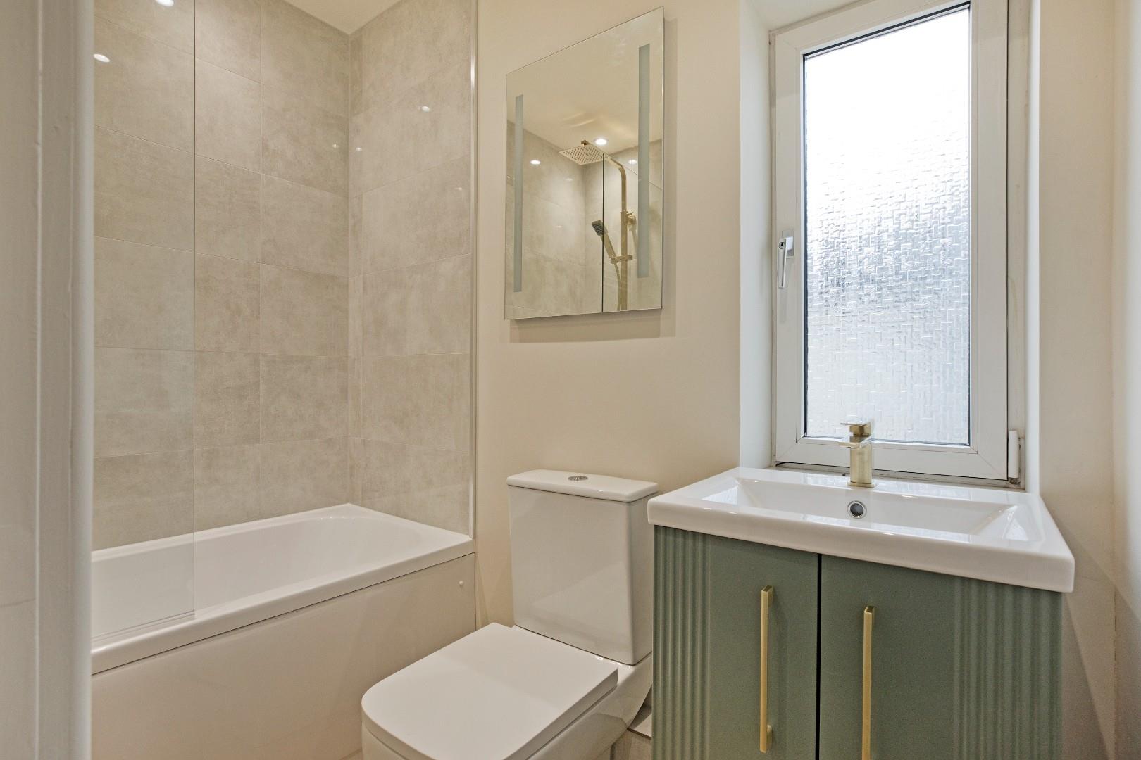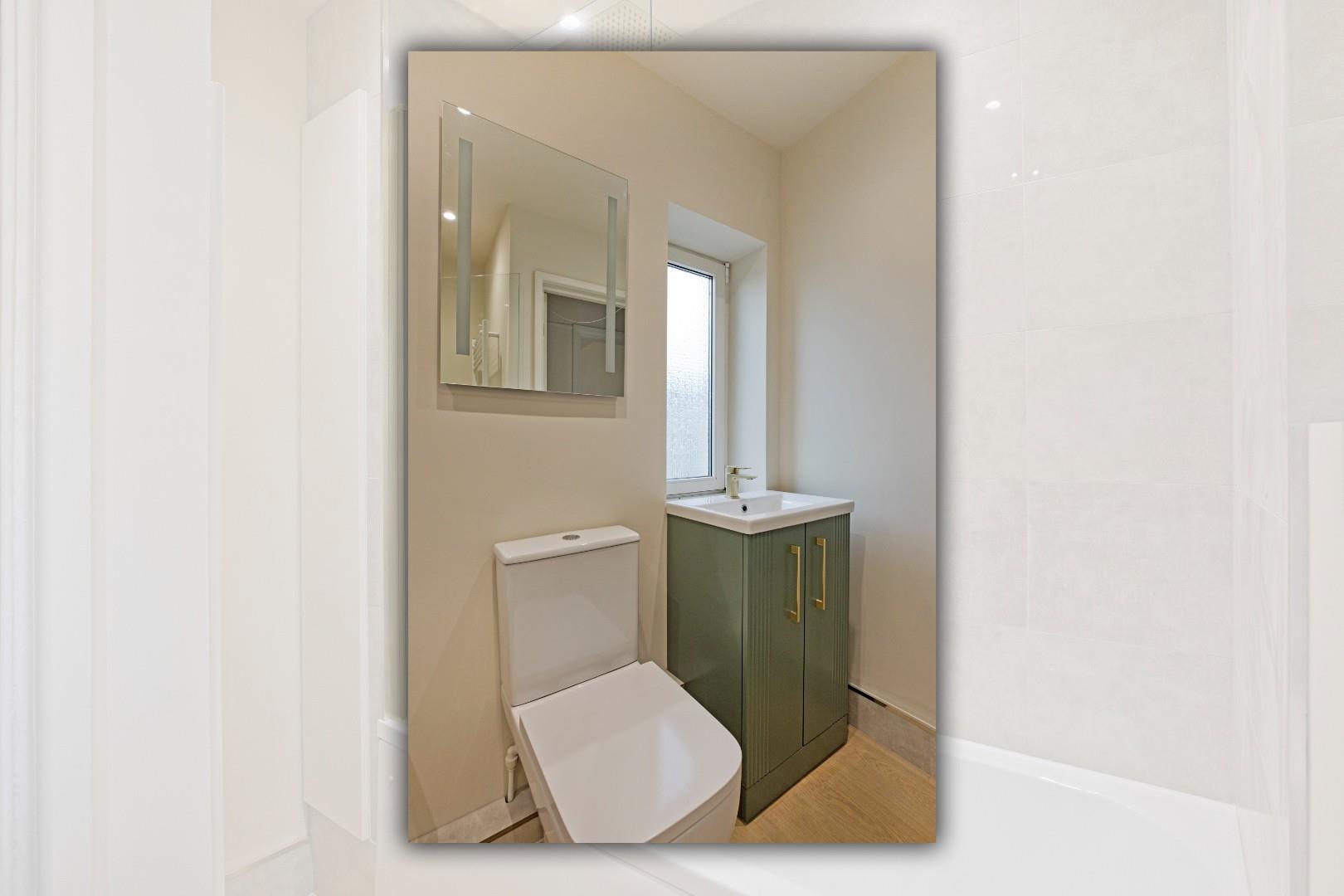 A beautifully styled, three-piece house bathroom with low-level W.C., handbasin with gold mixer tap set in a vanity unit and panel bath with gold mixer tap and drench shower plus additional shower attachment. Neutral wall tiling and glazed screen. White, ladder style, heated towel rail, fitted cupboard with shelving providing storage and LED wall mirror. Obscure, double glazed window to side elevation, downlighting.