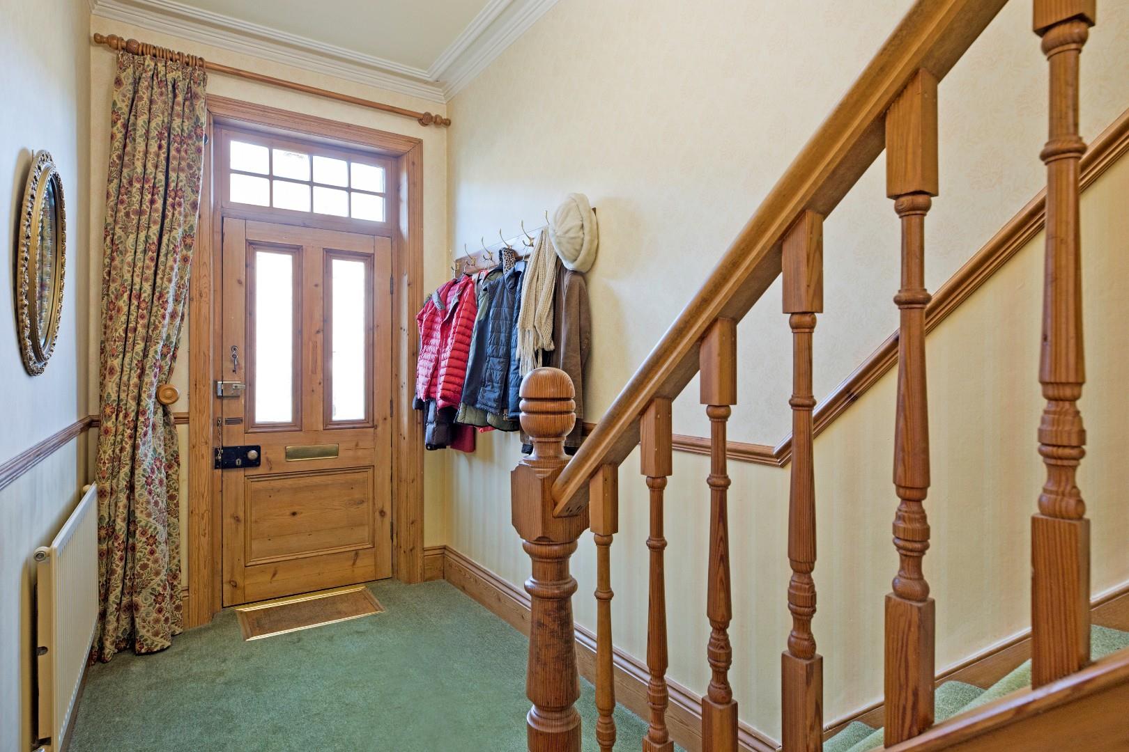 A smartly presented, solid timber half glazed door with two opaque glazed panels and multi paned transom light over opens into a bright and welcoming entrance hall with room for an item of furniture or to hang coats. Deep cornicing and a dado rail enhance the characterful feel. The original staircase with spindle balustrade leads to the first floor. Carpeting and radiator.