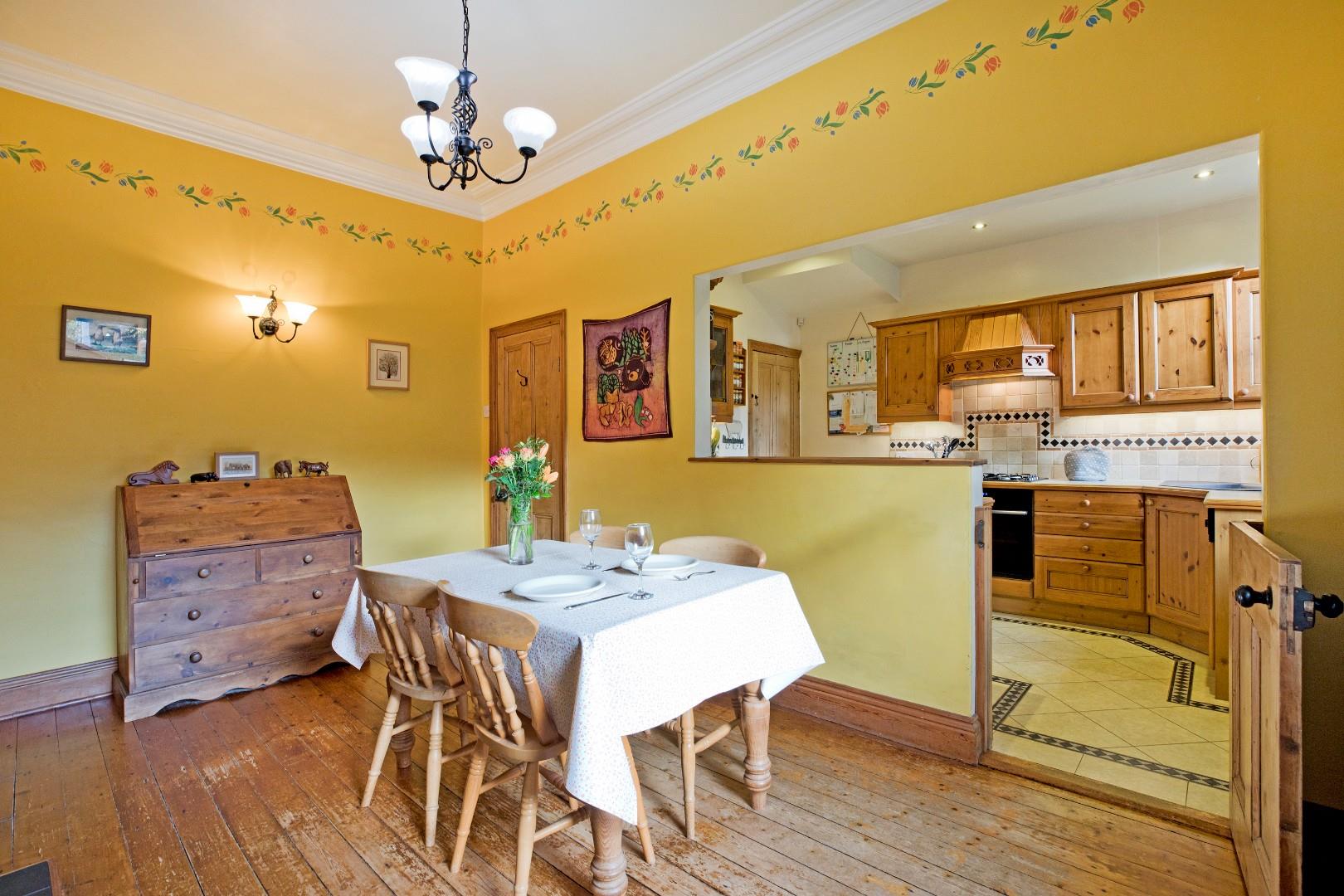 Doors lead into a good sized sitting room with bay window and charming fireplace housing an open fire and the spacious dining room with original cupboards and open into the kitchen to the rear with charming, pine fronted, fitted units and integrated appliances. A lovely, stone built entrance porch leads out to the south facing garden. There is ample room for a large, family dining table; this is a very sociable, entertaining space. Stone steps lead down to a most useful cellar area, ideal for storage and leading to a utility room with space and plumbing for a washing machine and tumble dryer. To the first floor there are three bedrooms, two being generous doubles, and the traditional style bathroom. A further carpeted staircase leads up to two double bedrooms, supported by a modern shower room. There is also a box room, ideal for storage or even a small office.