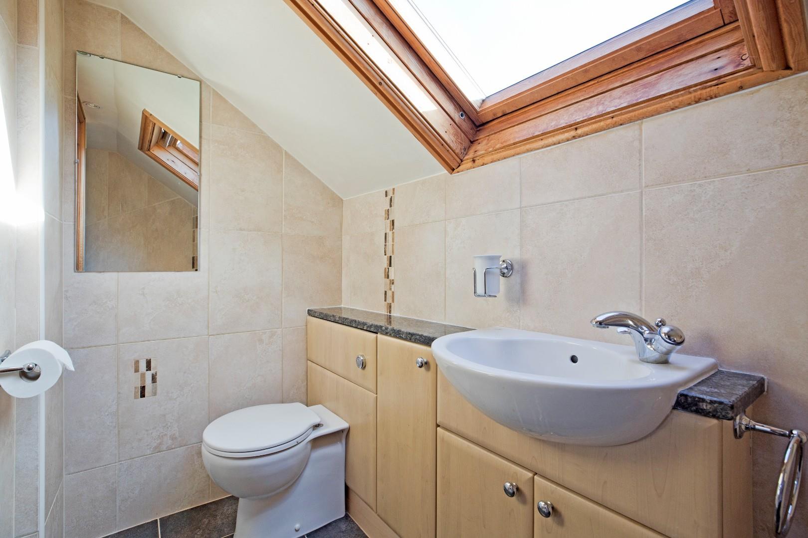 A modern shower room comprising of a shower cubicle with glazed screen, a vanity washbasin and a concealed cistern w/c. Fully tiled to the walls with complementary floor tiling, downlighting and under eaves storage. Chrome, ladder, towel radiator and fitted wall mirror. A Velux window affords ample natural light.