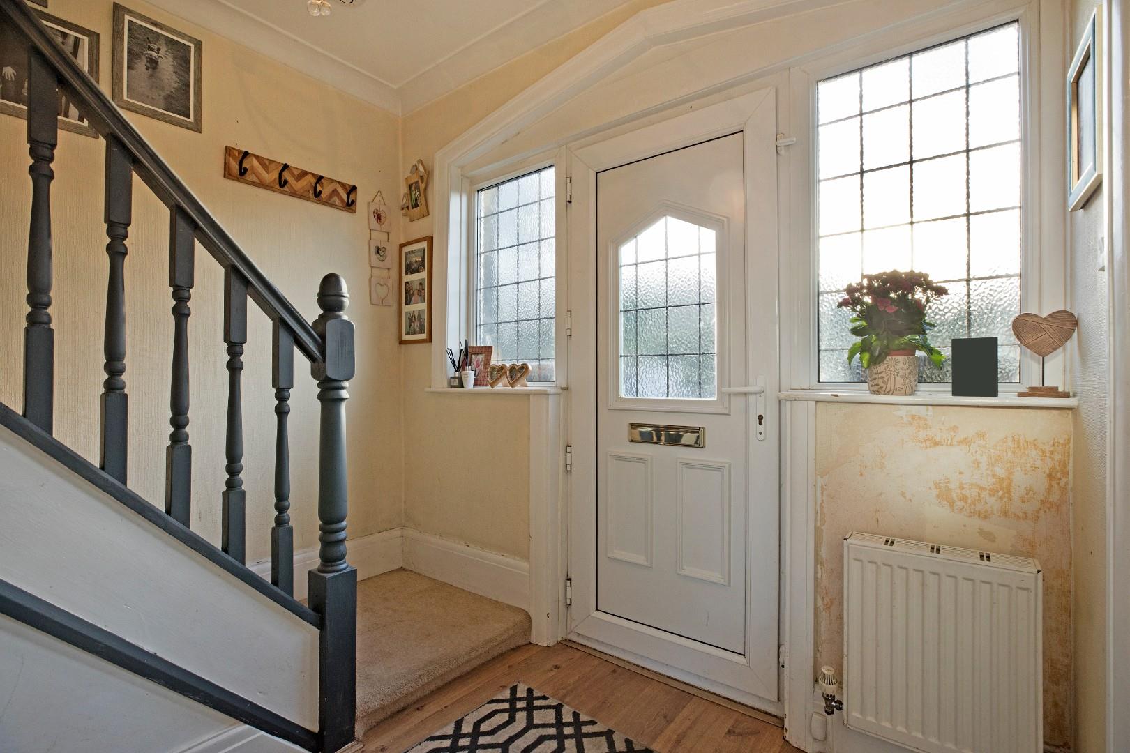 A half obscure glazed, uPVC entrance door with side windows opens into a welcoming entrance hall. Laminate flooring, ceiling light, coving, radiator. Doors lead into the lounge and kitchen. A carpeted staircase with timber balustrading leads to the first floor of the property.