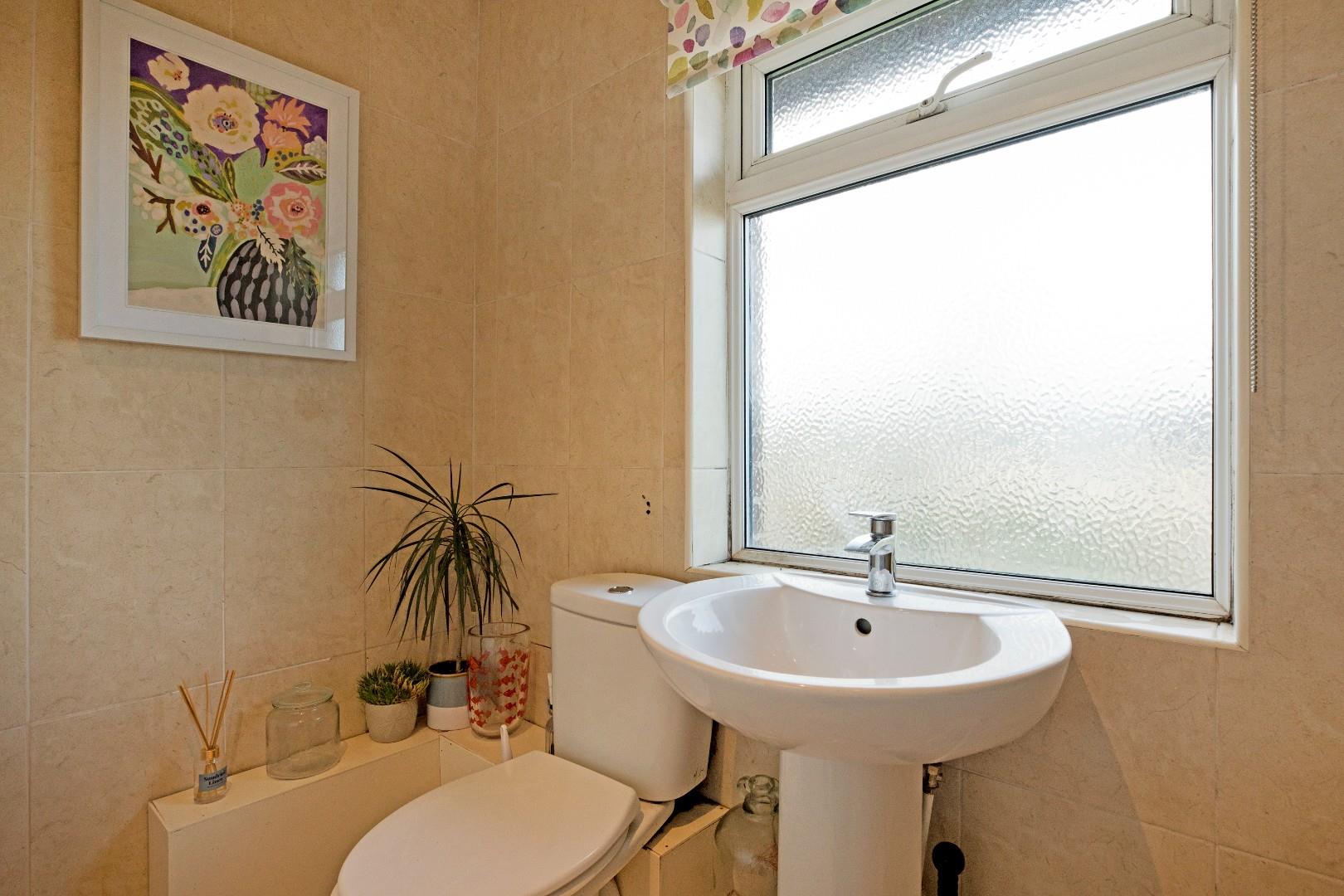 A three-piece house bathroom with low-level W.C., pedestal handbasin with chrome mixer tap and bath with tiled side with thermostatic drench shower plus additional shower attachment. Neutral, stone effect wall and floor tiling, radiator, extractor. Downlighting, obscure double glazed window to rear.