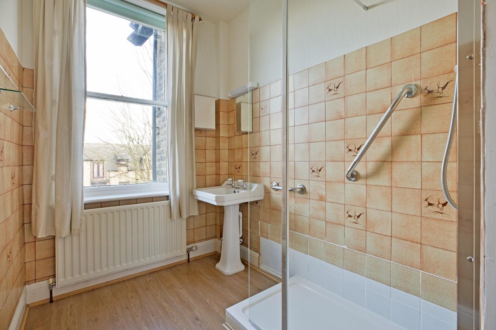 With a traditional style, pedestal handbasin with chrome taps and shower cubicle with fixed glazed screen. Wall tiling, laminate flooring, sash window, radiator.