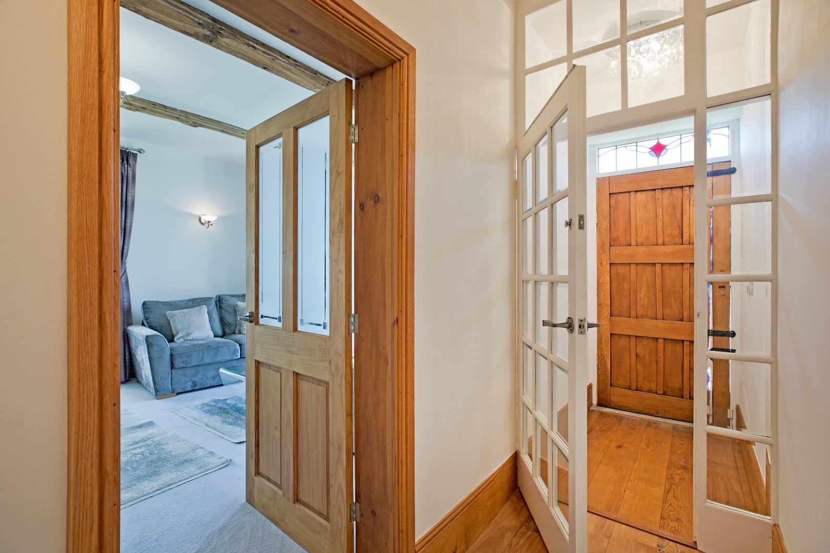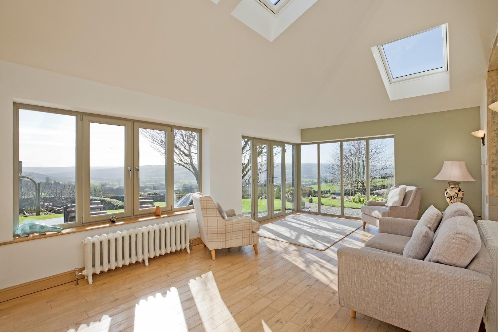 This superb addition to the property has extended the living space and maximised the fantastic views available. The double doors leading out onto a good-sized patio create a wonderful inside outside flow, making this a lovely entertaining space. The oak flooring, ornate, traditional style radiators and exposed stone to one wall all add to the characterful feel. Light floods in through two sets of double doors, Velux windows and further glazing.