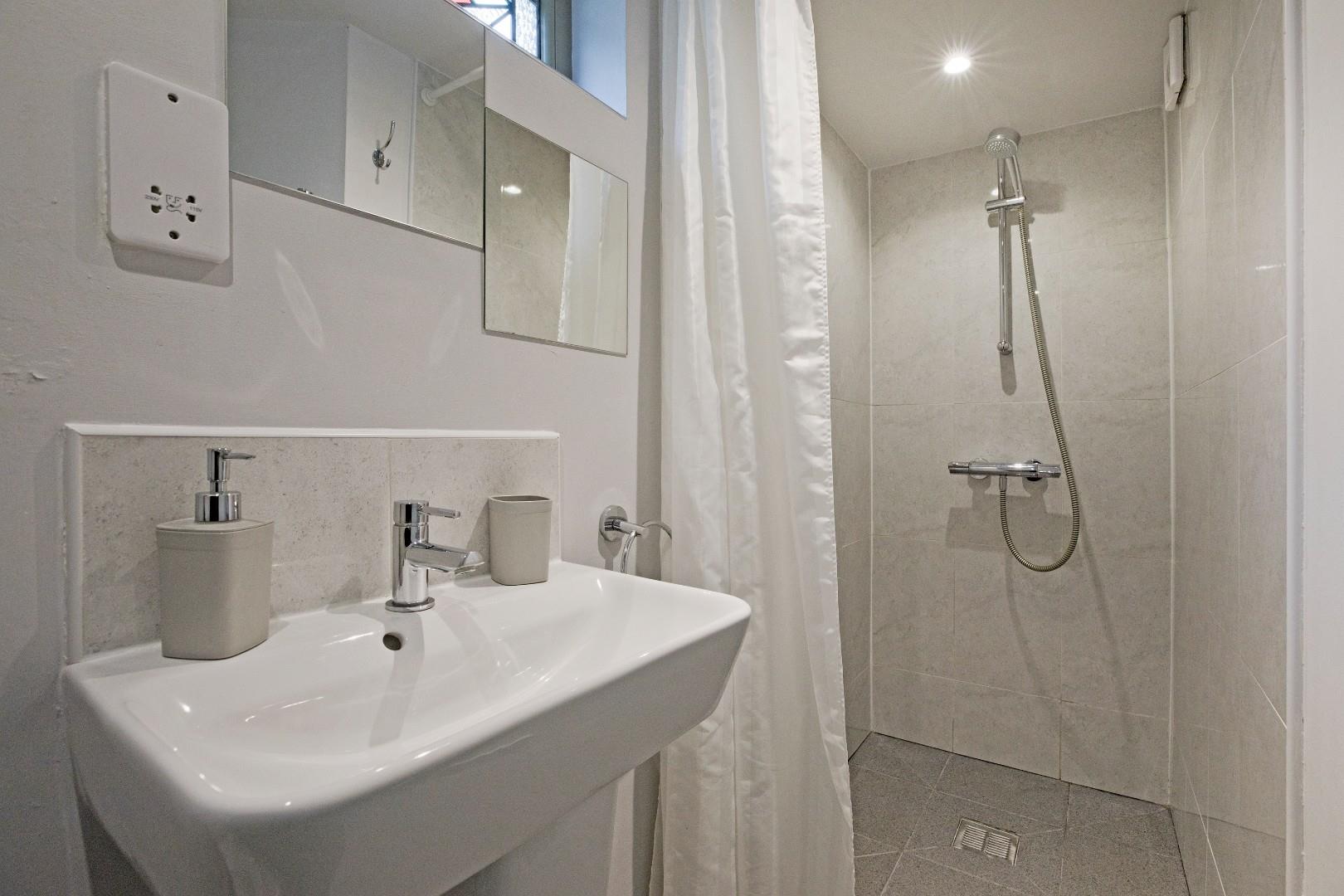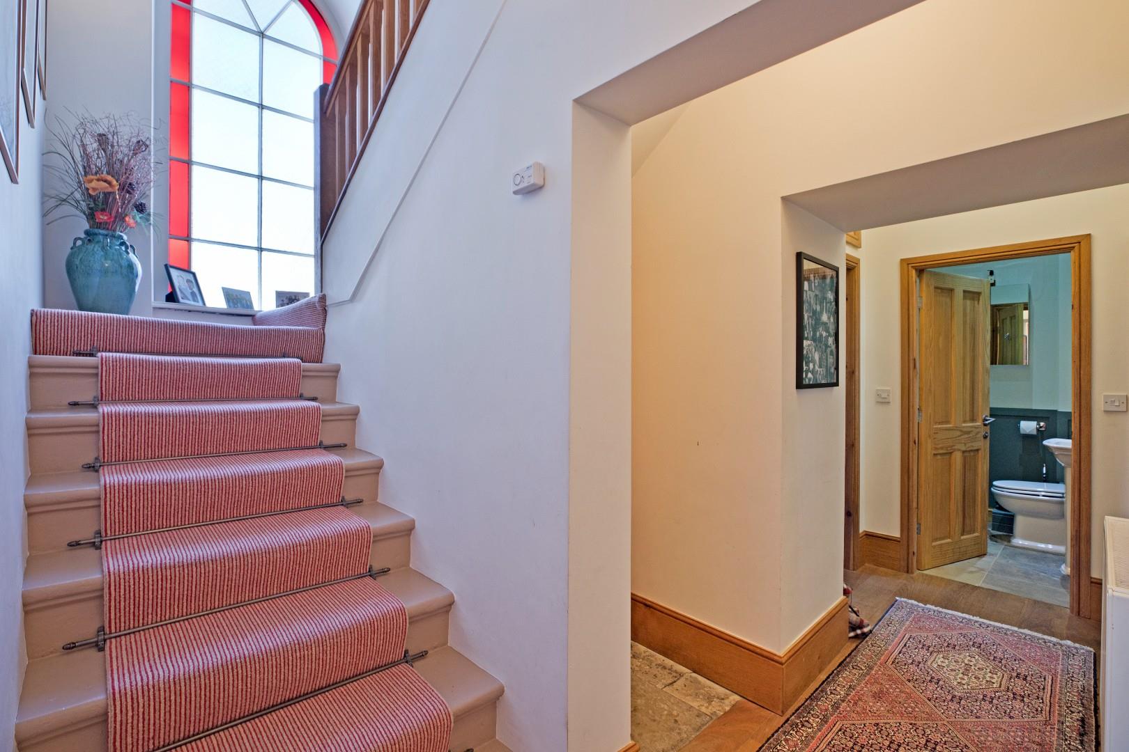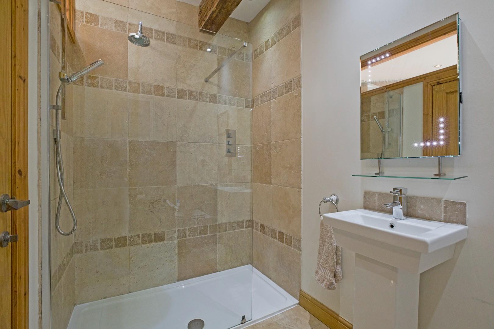 Comprising of a large, walk-in shower with glazed screen and mains drench shower with separate hand held shower attachment, a pedestal washbasin with mixer tap and tiled splashback and a low-level w/c. Travertine tiles to the wall around the shower with matching floor tiling. Chrome, ladder, towel radiator, downlighting. Beam lending character and opaque glazed windows borrowing light from the principal bedroom.